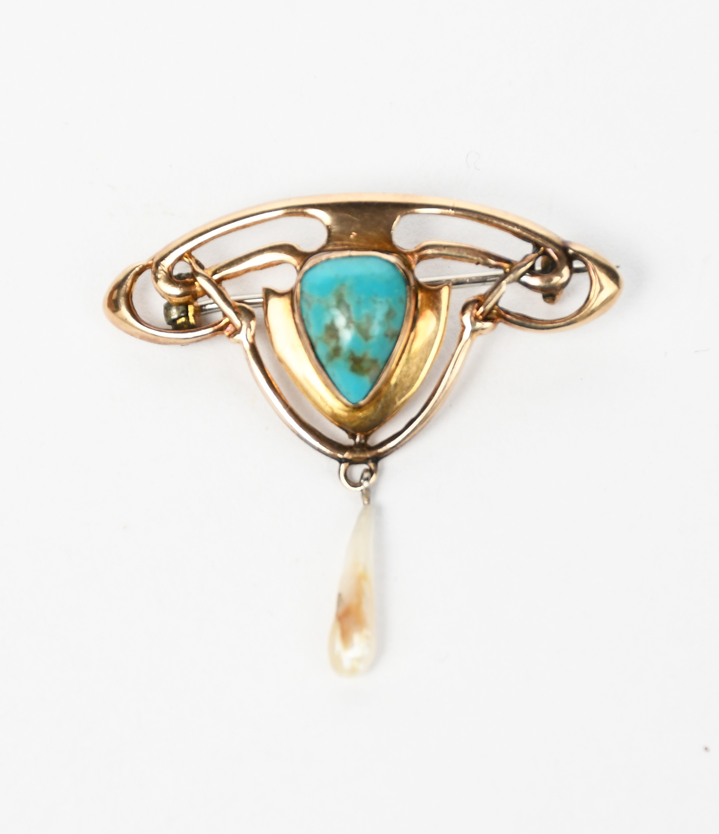 An Art Nouveau Henry Matthews gold brooch, pierced entrelac frame set with turquoise cabochon, with thin pearl drop, stamped marks, London 1901, 3.5cm. wide