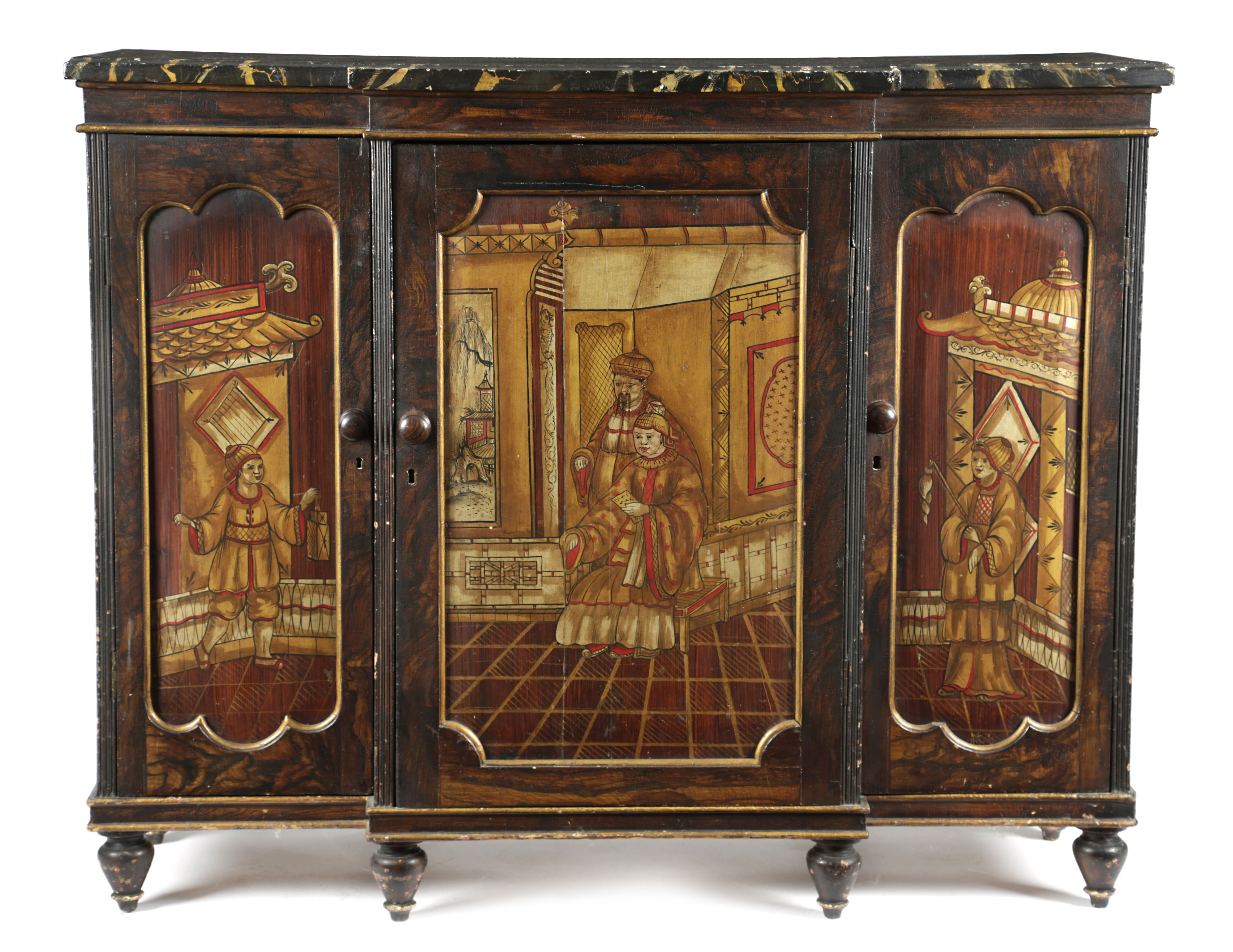 A REGENCY SIMULATED ROSEWOOD AND CHINOISERIE BREAKFRONT SIDE CABINET
