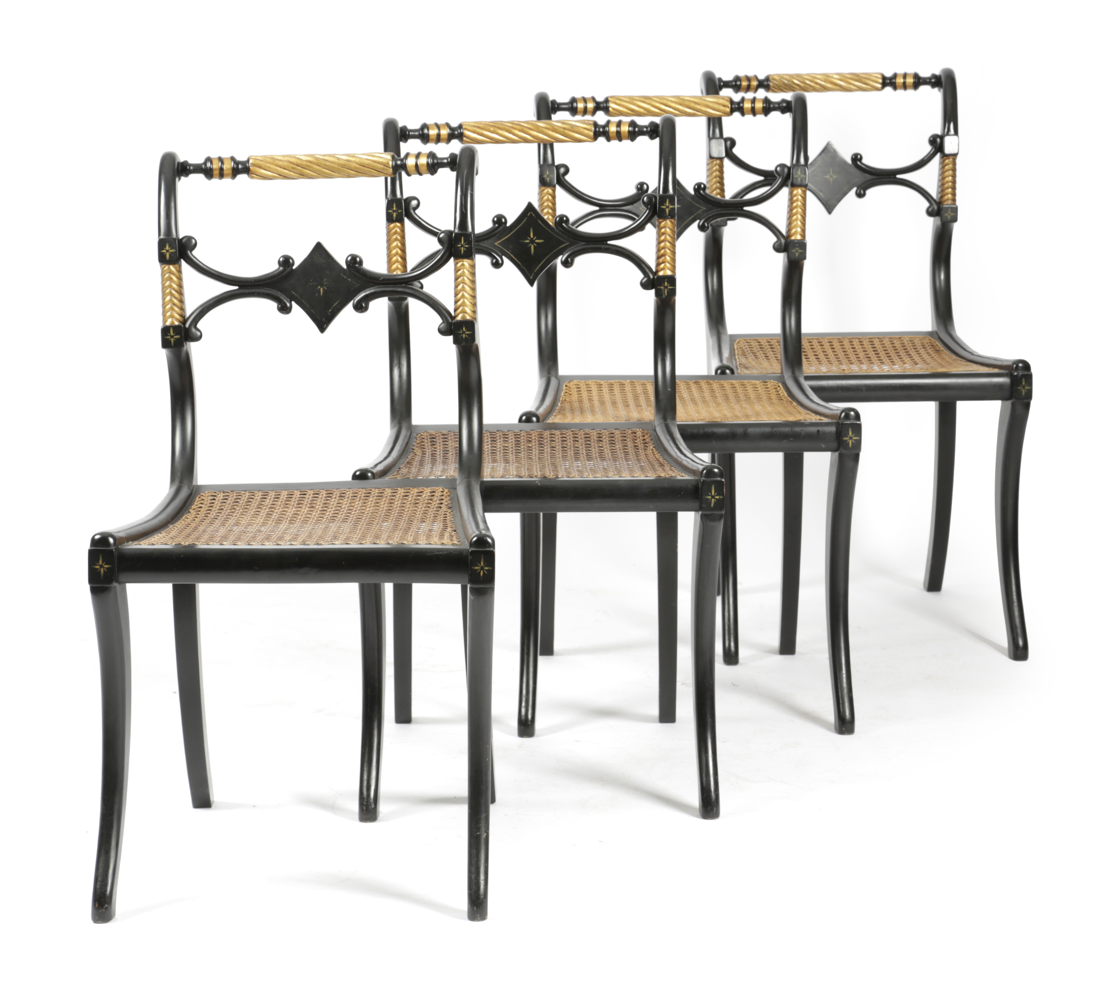 A SET OF FOUR EBONISED AND PARCEL GILT SIDE CHAIRS