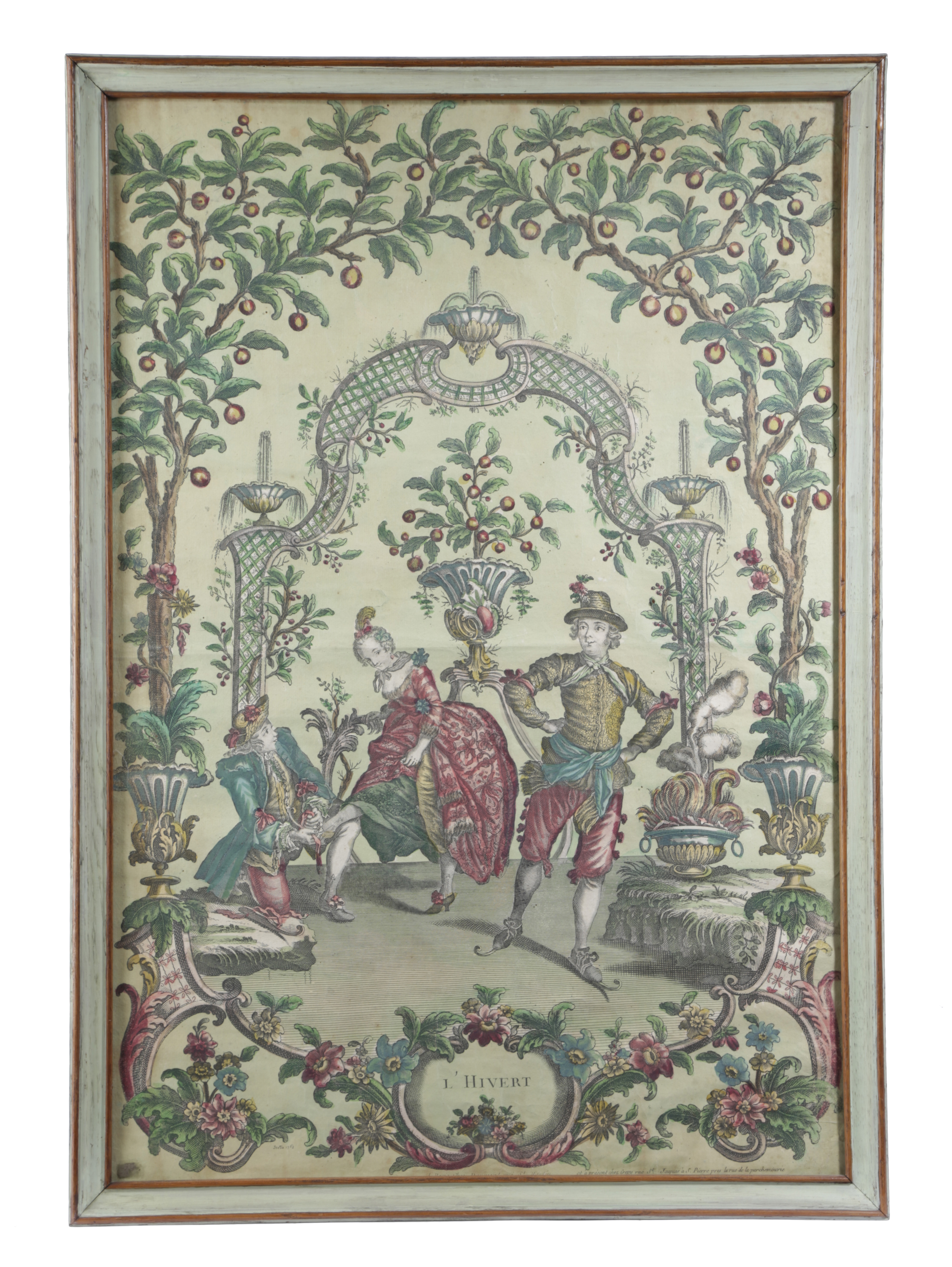 depicting an allegorical scene respectively of summer and winter, framed with branches and garlands of flowers above a Rococo cartouche titled 'L'Hivert' and 'L'Este', published by Daumont, Paris, each in a glazed wooden frame (2)