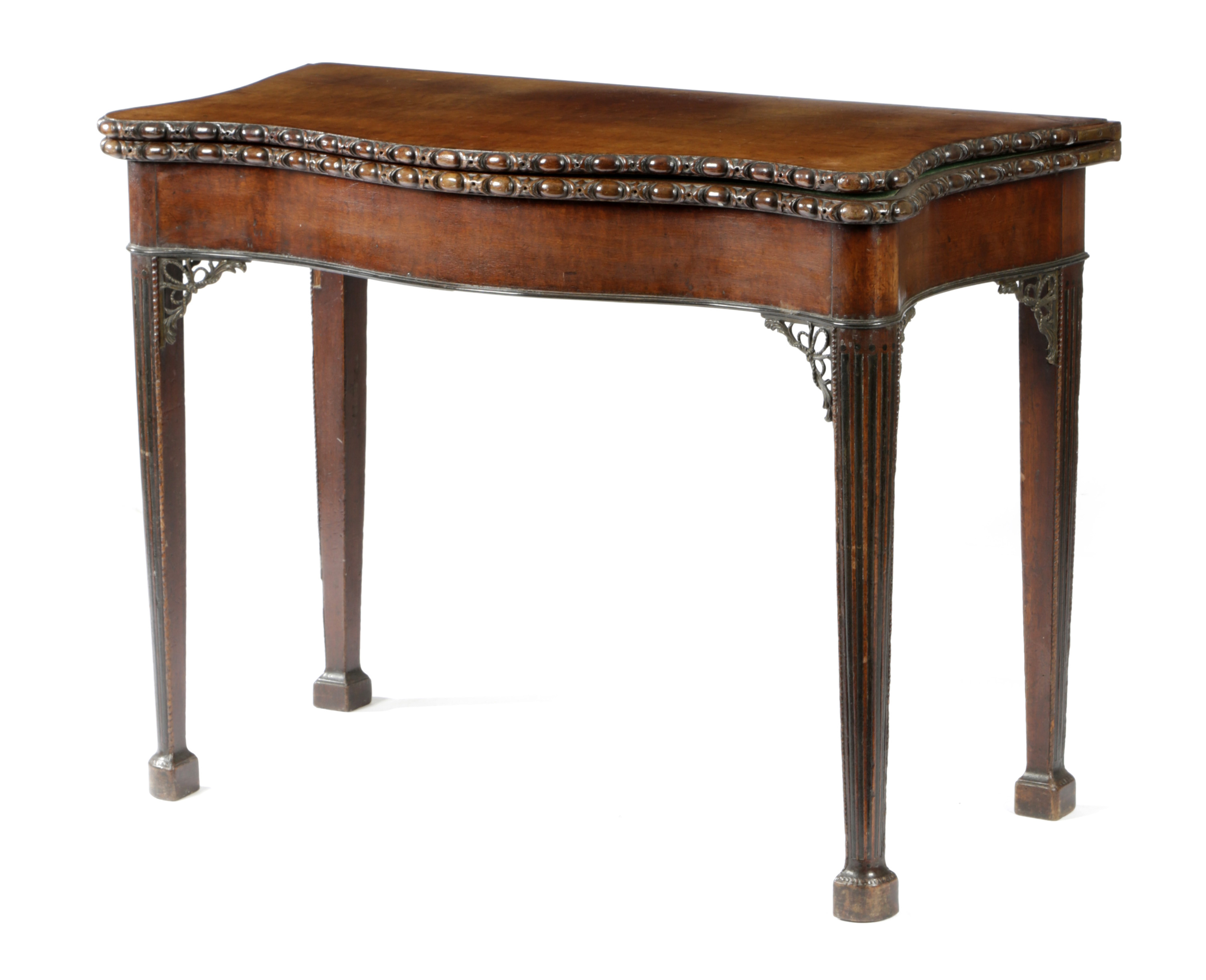 with an egg and dart carved moulded edge, with applied brass brackets and ebonised fluted legs