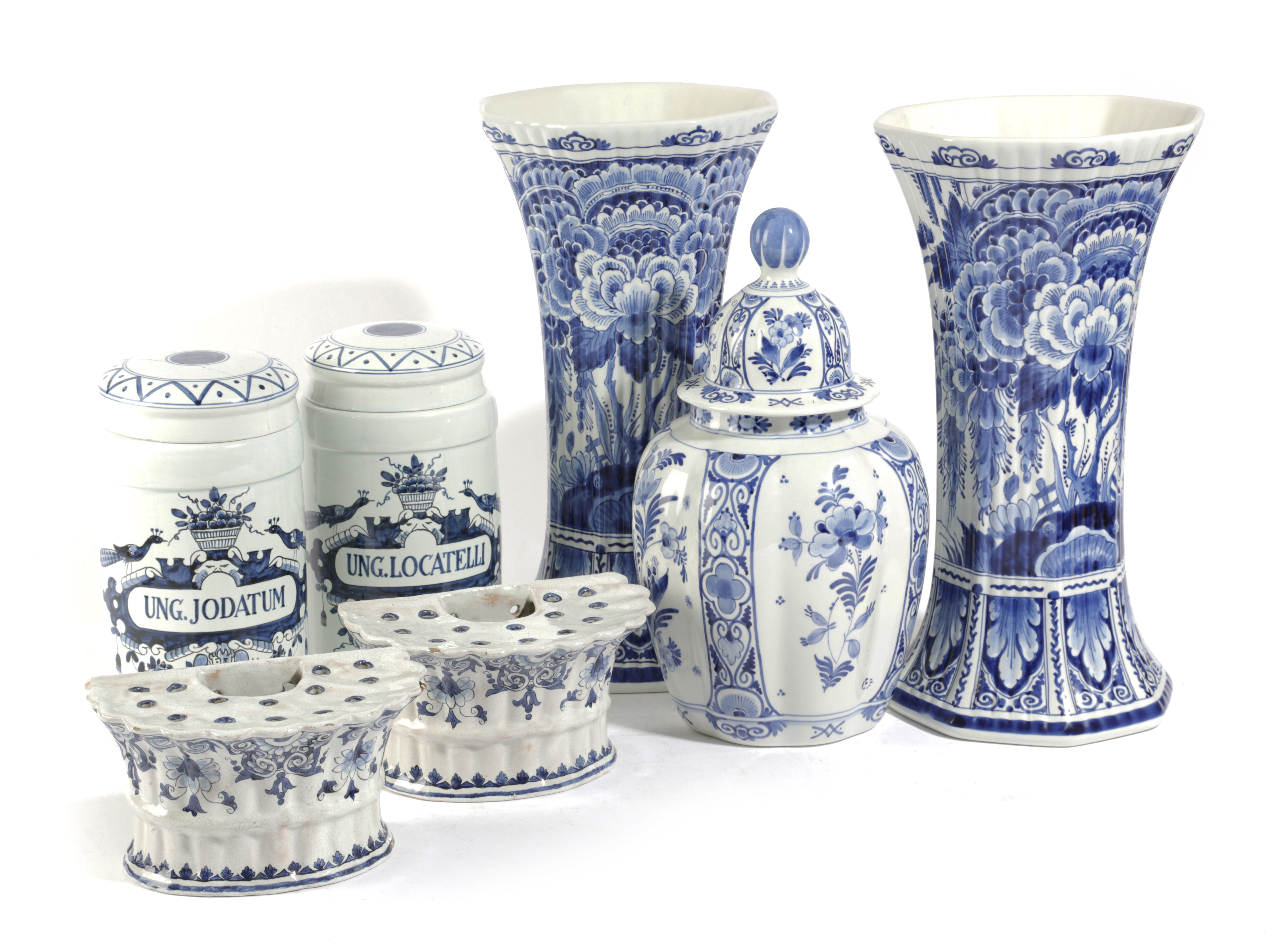 comprising: a pair of Dutch Delft vases of flared form, a lidded lobed vase, a pair of drug vases and covers, and a pair of flower pots, each with a paper laber for 'Dulany & Co.' (7)