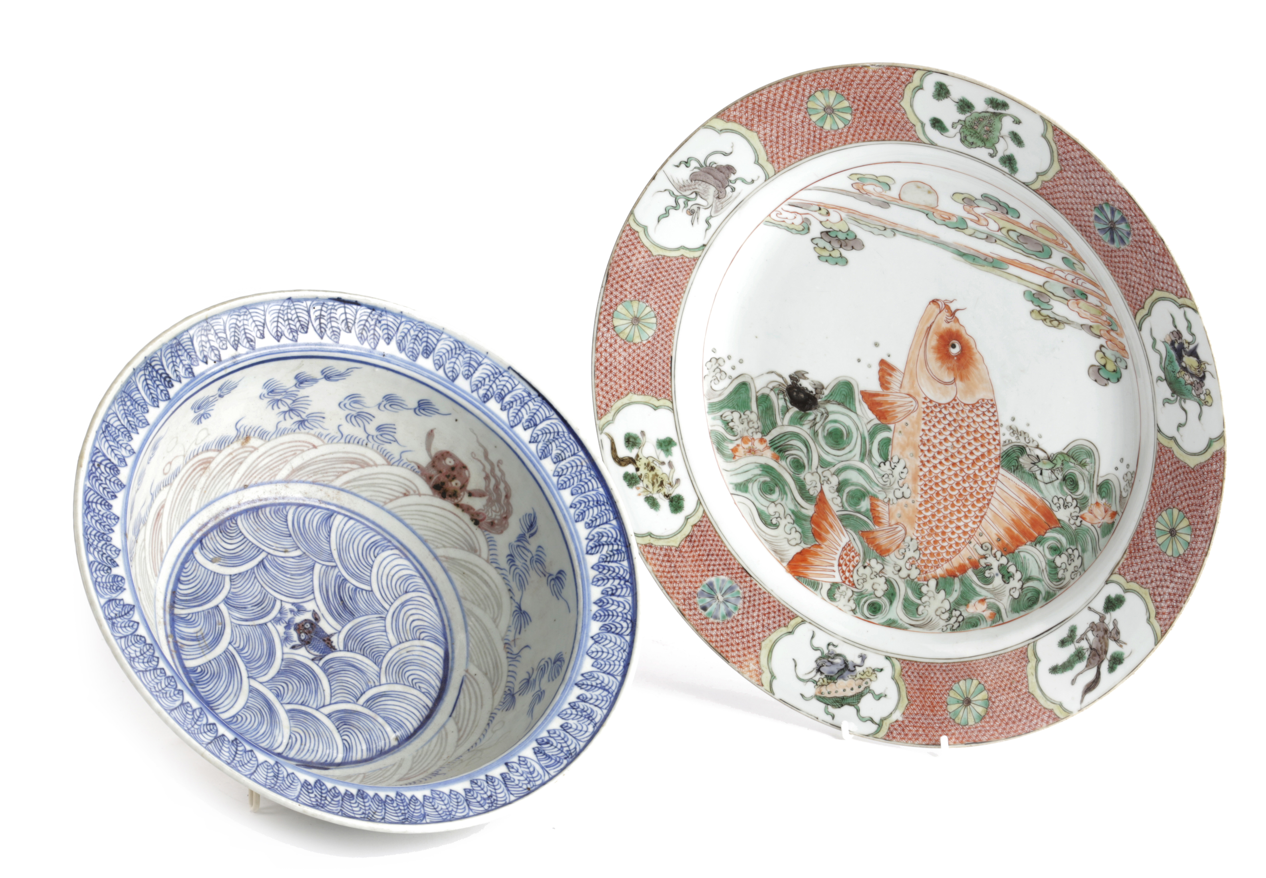 the centre decorated with a fish and a crab, together with a blue and white fish bowl (2)