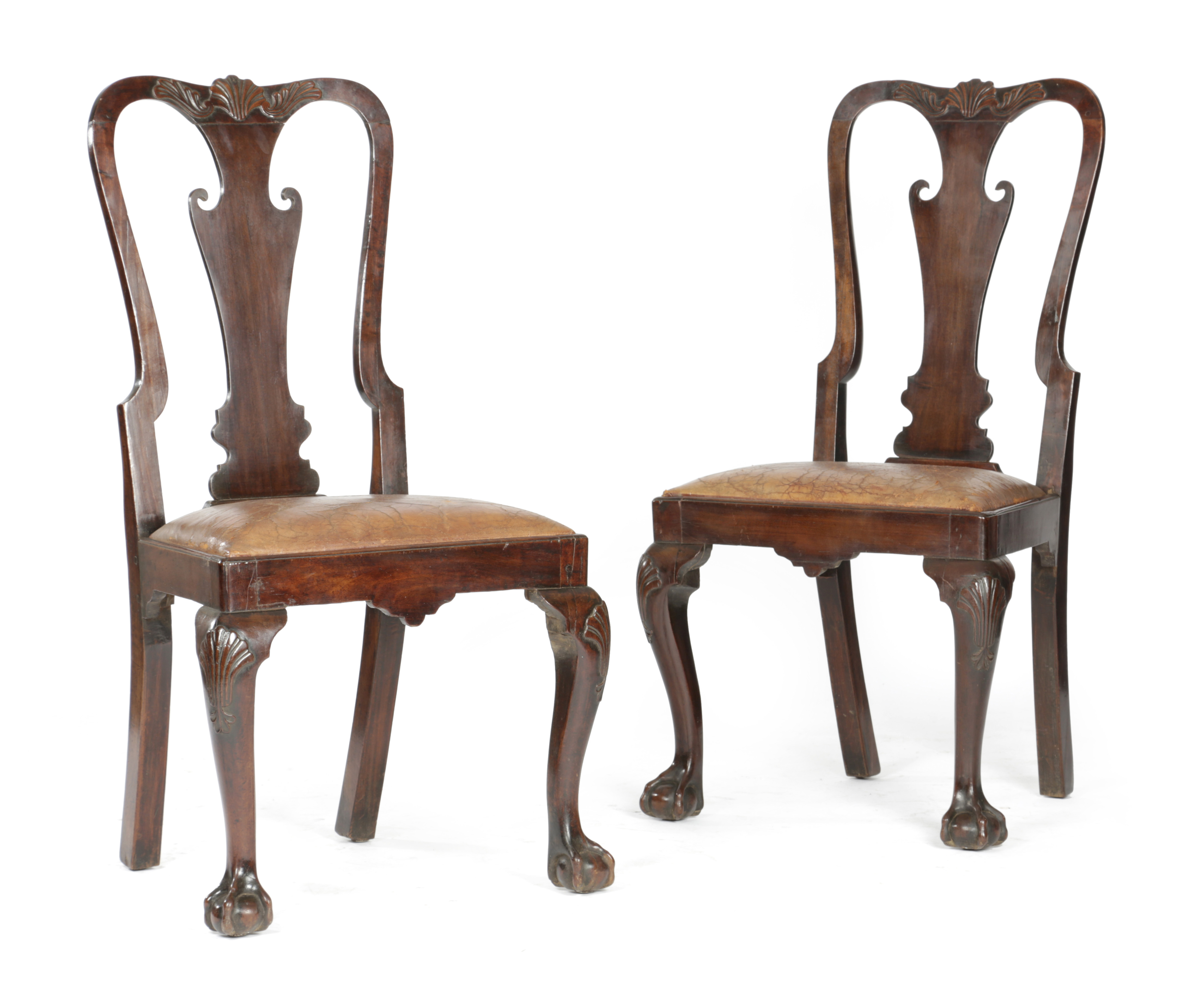 each with a vase shaped splat above a drop-in seat on shell capped cabriole legs and claw and ball feet (2)