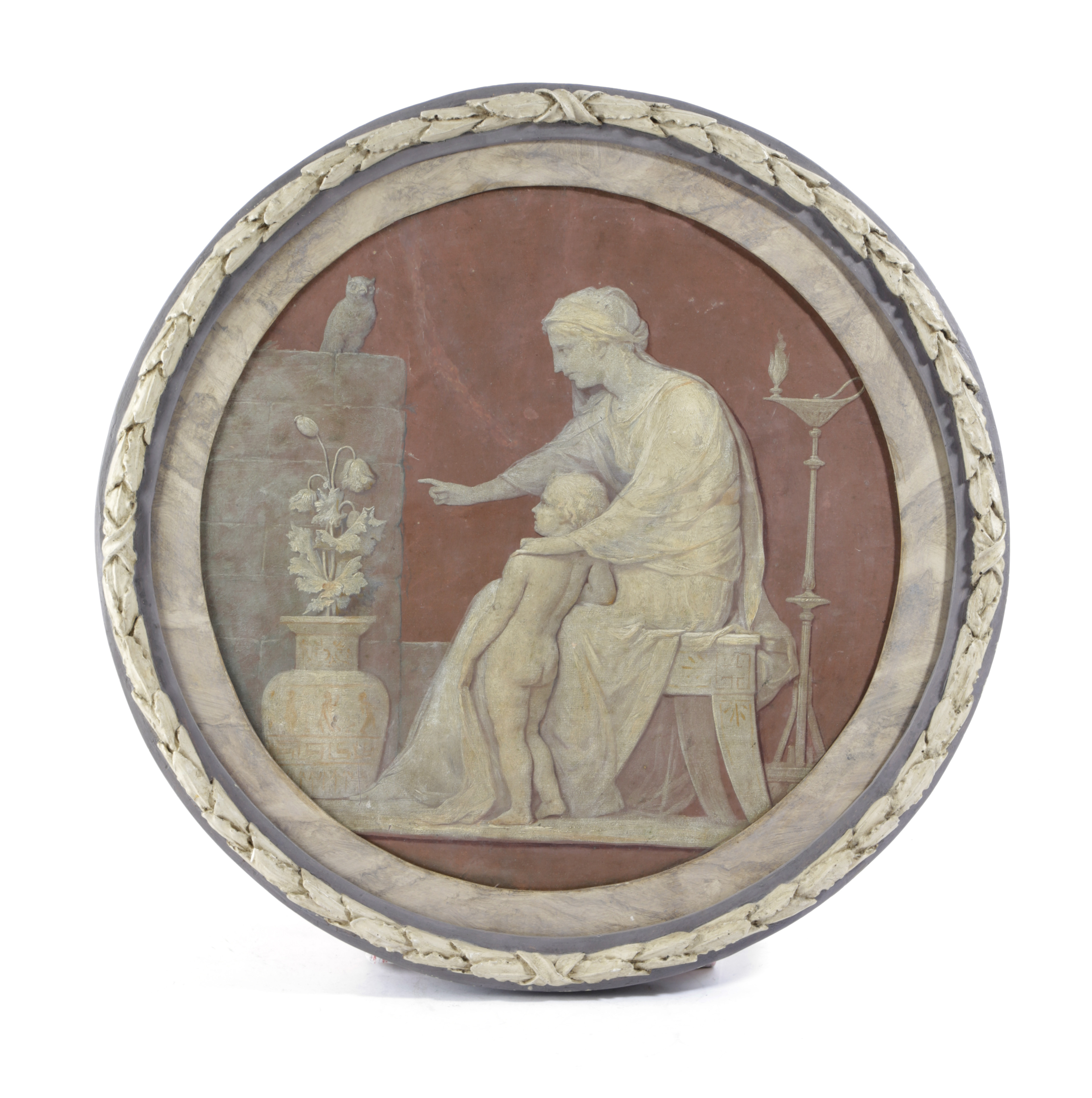 each depicting an allegory of learning, in a painted wood frame carved with a laurel wreath (2)