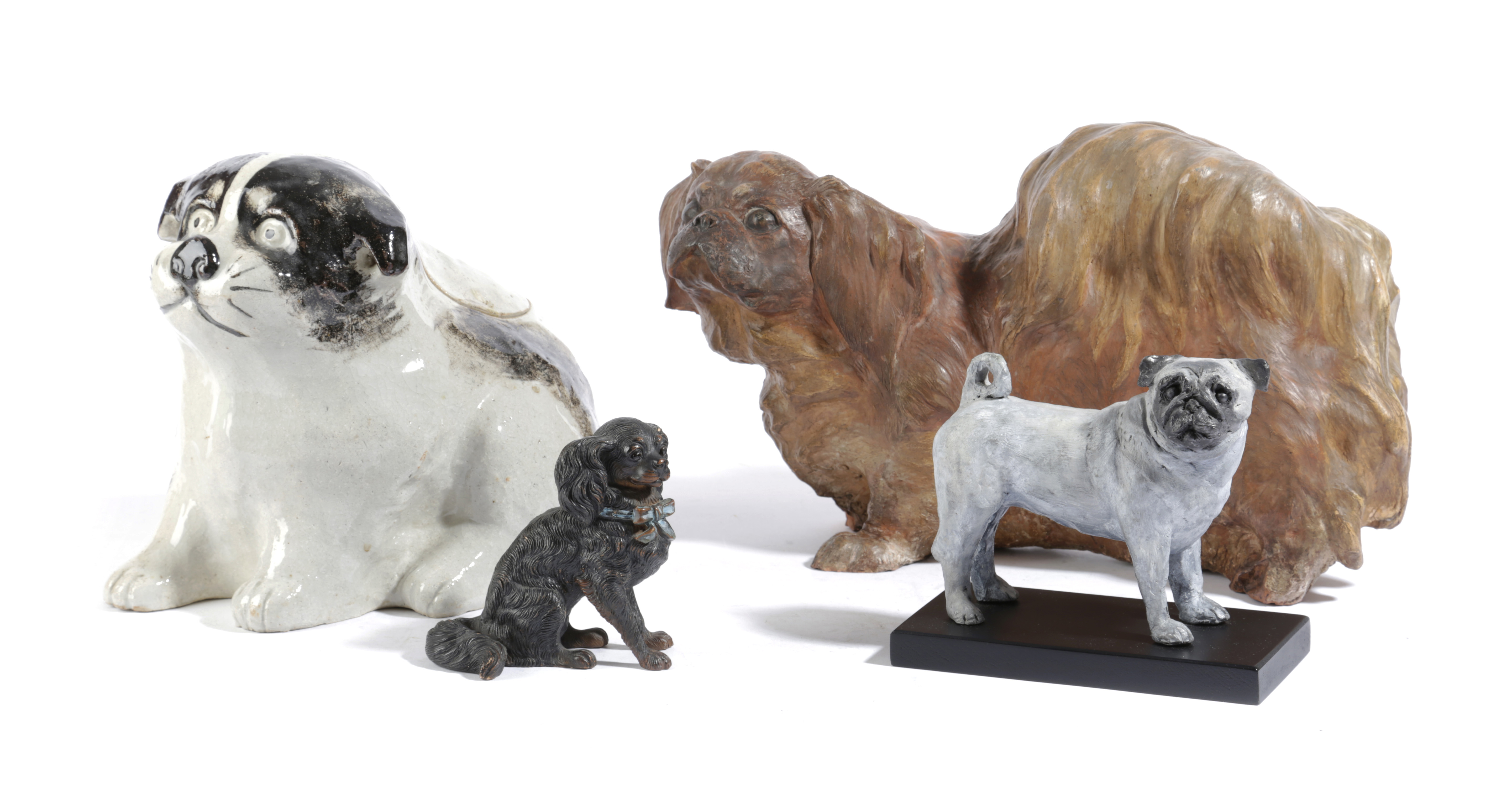 together with a Japanese pottery jar modelled as a dog, a painted terracotta model of a spaniel and a modern model of a pug dog (4)