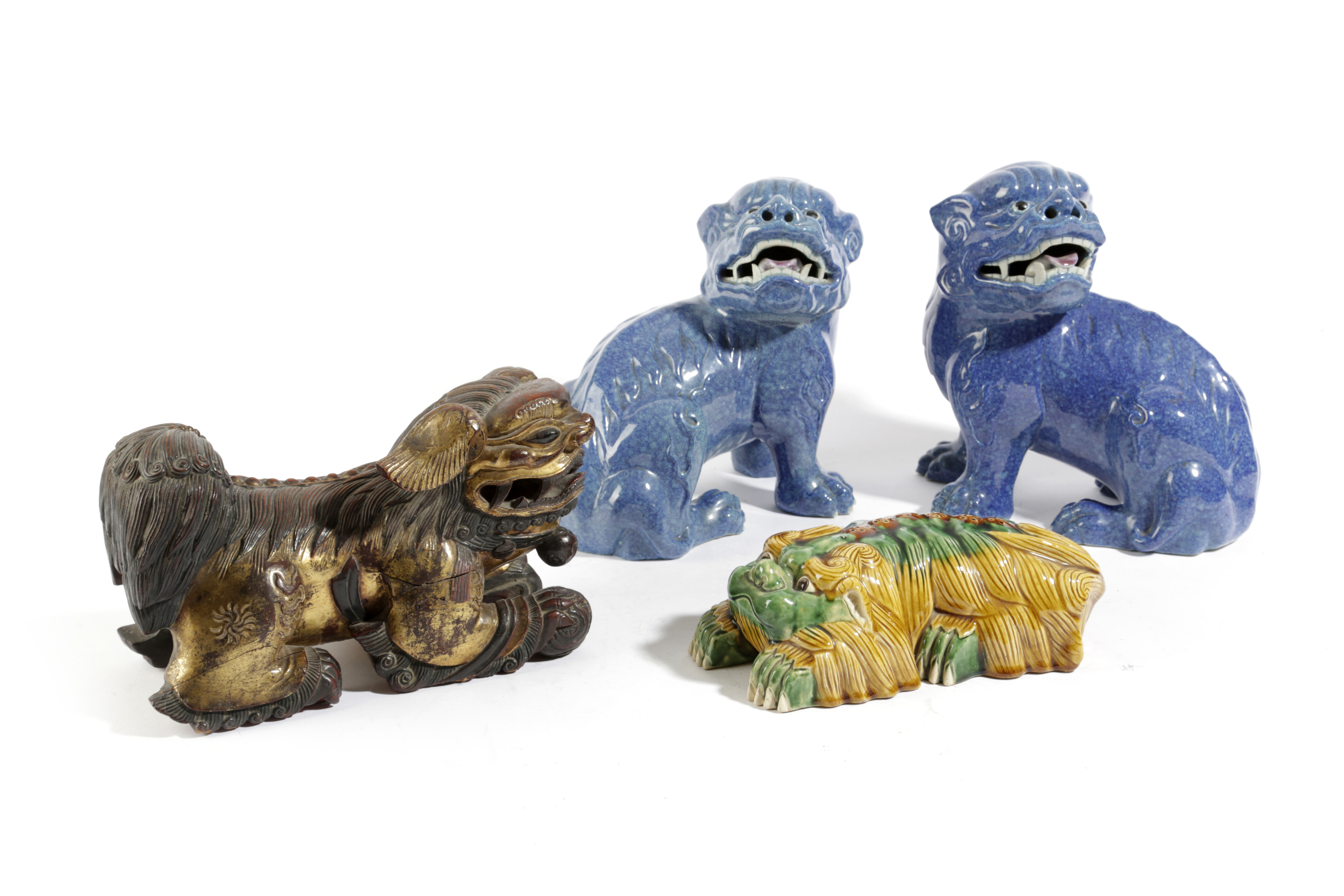 each with a robin's egg glaze, together with a Chinese lacquered and giltwood lion dog and another example with a sancai glaze (4)