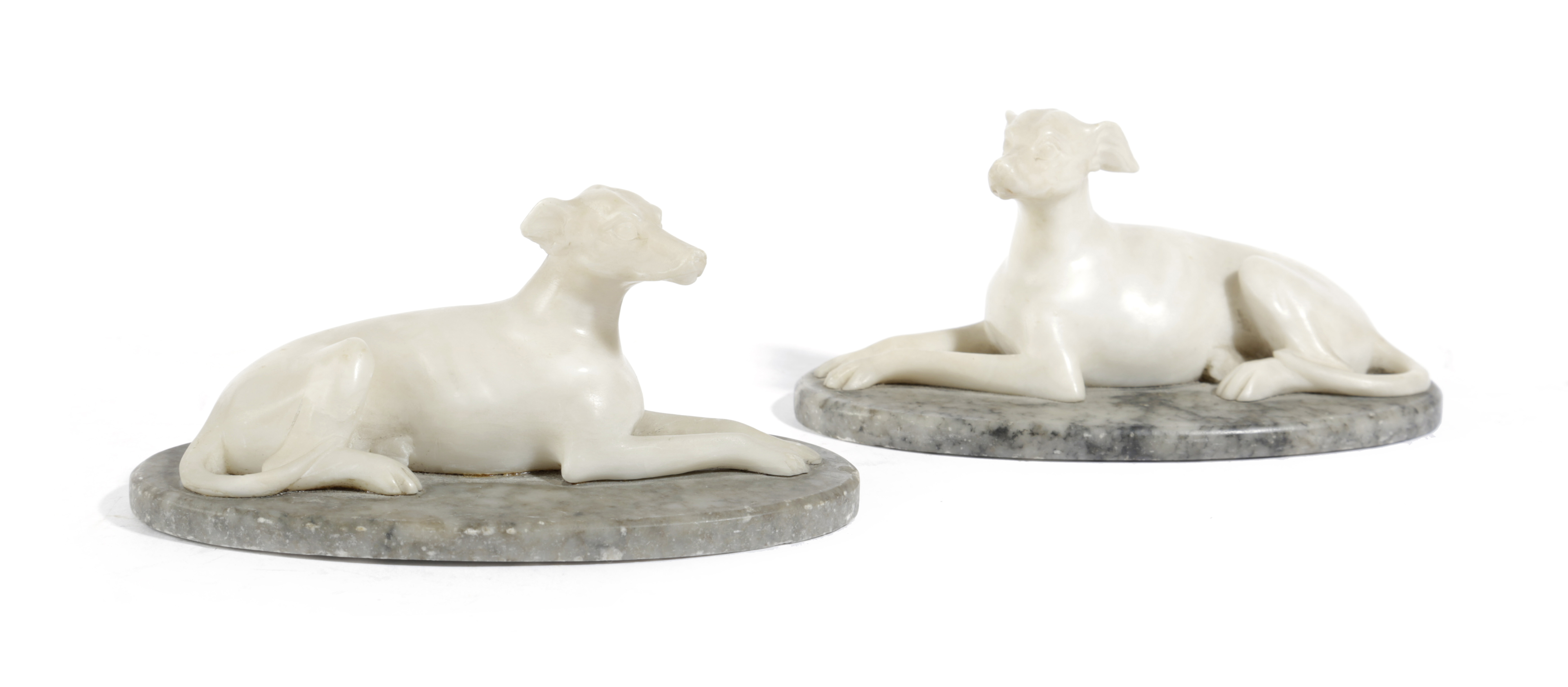 A PAIR OF ALABASTER MODELS OF RECUMBENT GREYHOUNDS