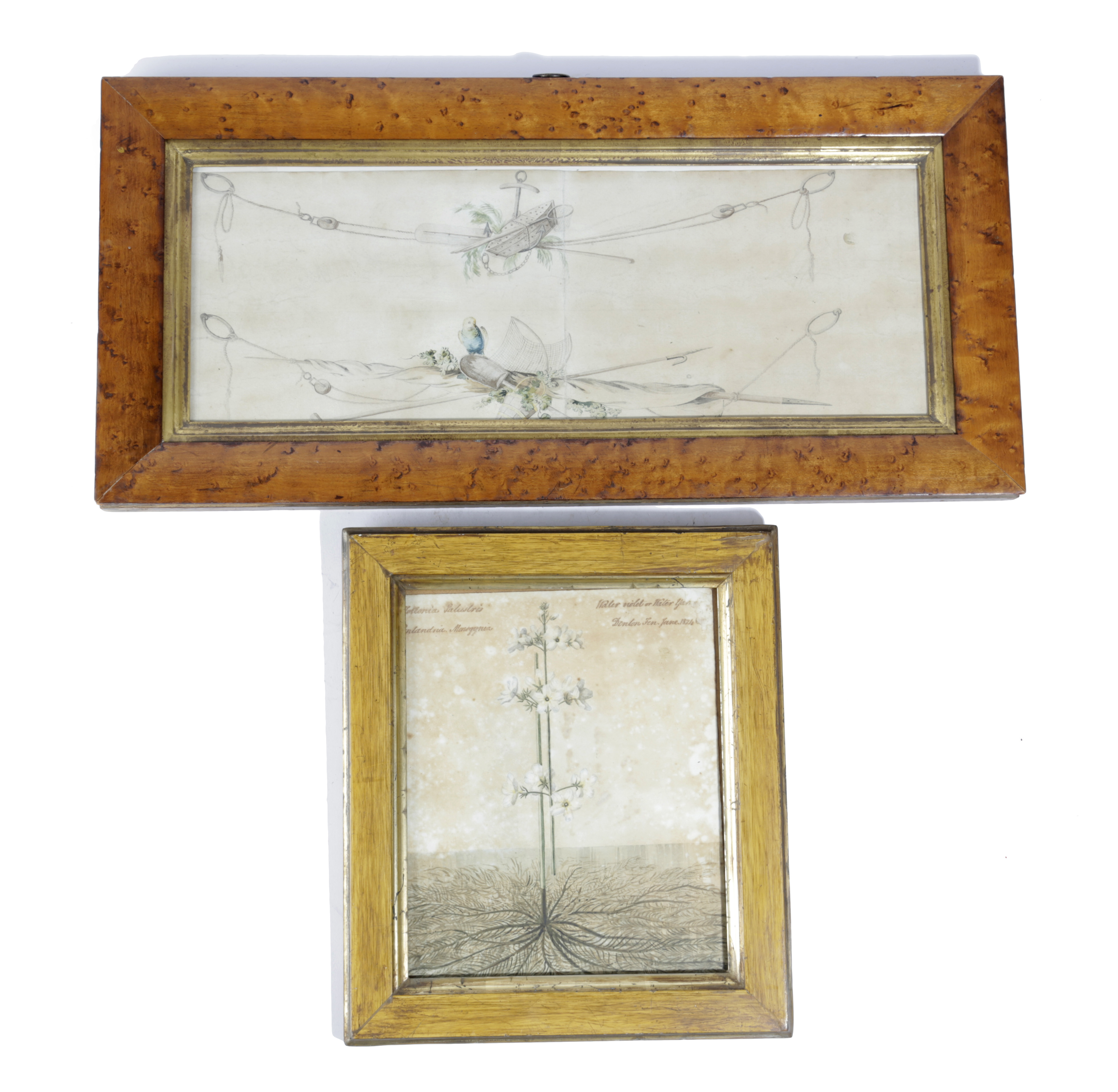 signed and dated 'Denton Fen. Jane. 1821', together with a trompe l'oeil watercolour of two garlands with sailing and fishing trophies and a parrot, signed 'Diets', each with a Charles Plante Fine Arts label to verso, in a glazed wooden frame (2)