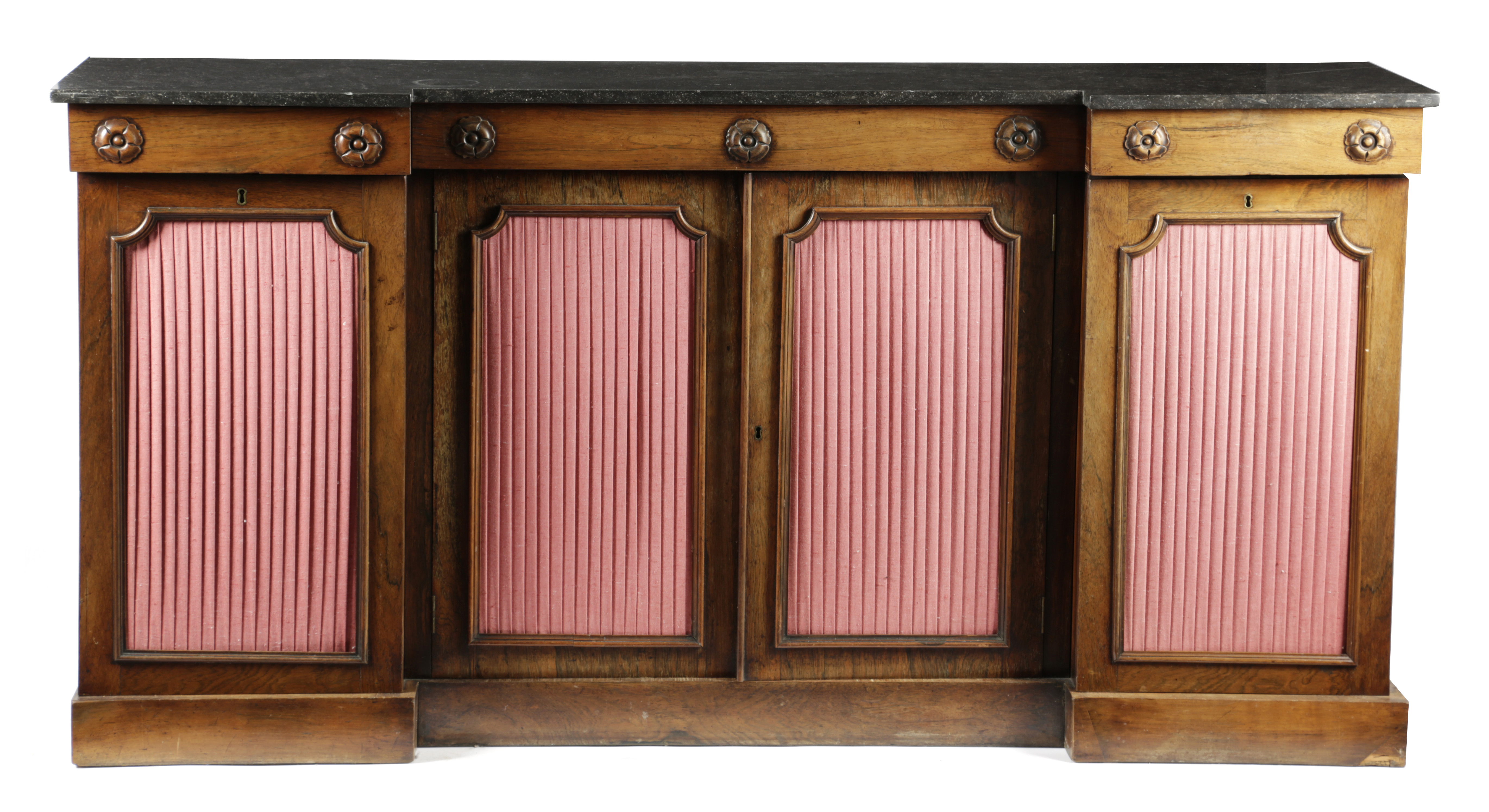 the grey marble top above pleated silk panelled doors enclosing shelves with applied foliate rondels