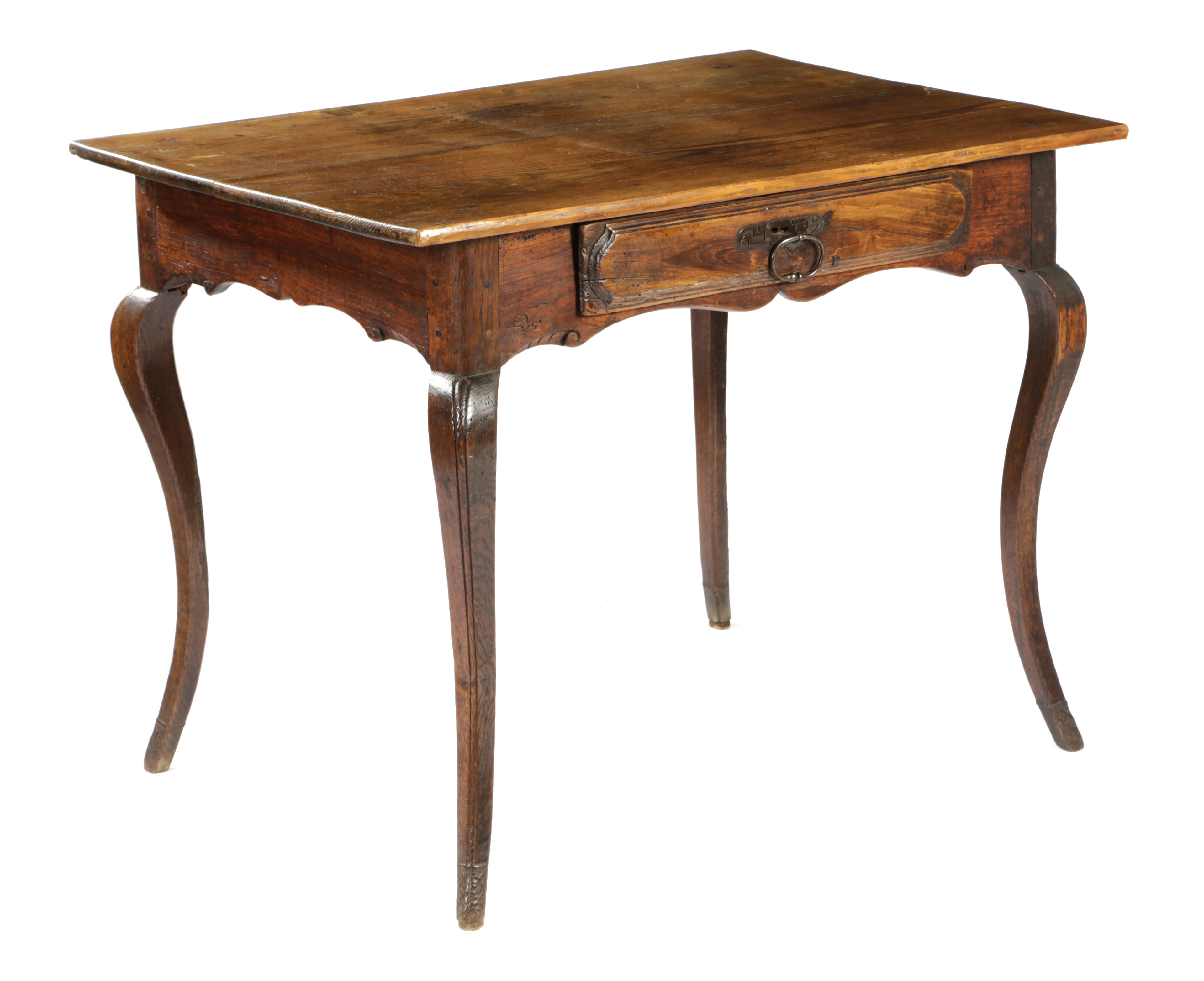 with a panelled freize drawer and a scrolled carved apron on cabriole legs, the feet carved with diamond lozenges
