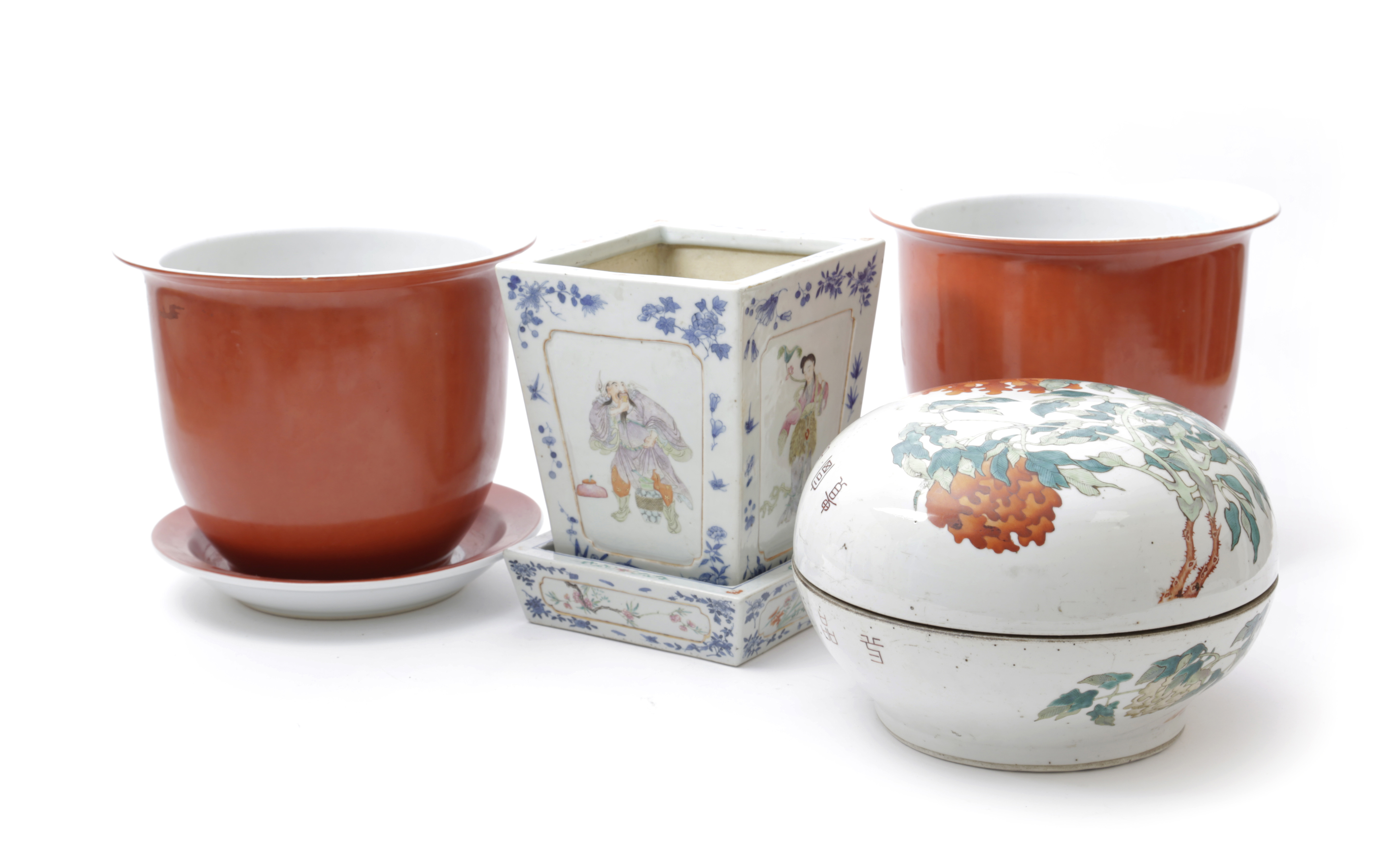 painted with panels of figures, the stand with panels of flowers, together with a Chinese box and cover decorated with flowers and with Chinese characters and a pair of red glazed jardinières on stands (4)