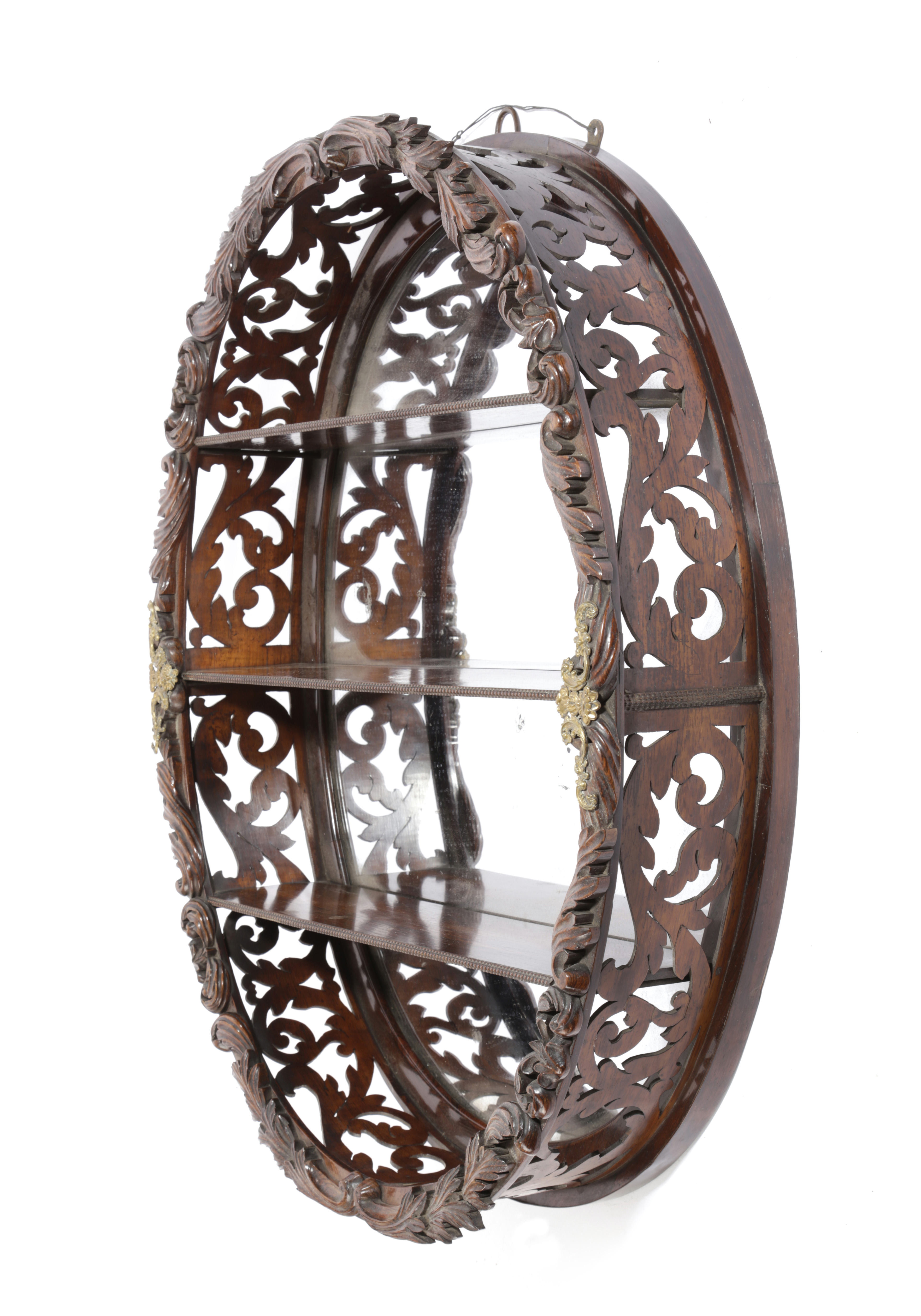 of oval form with a foliate carved and pierced border with gilt metal mounts, with three shelves before a mirrored back