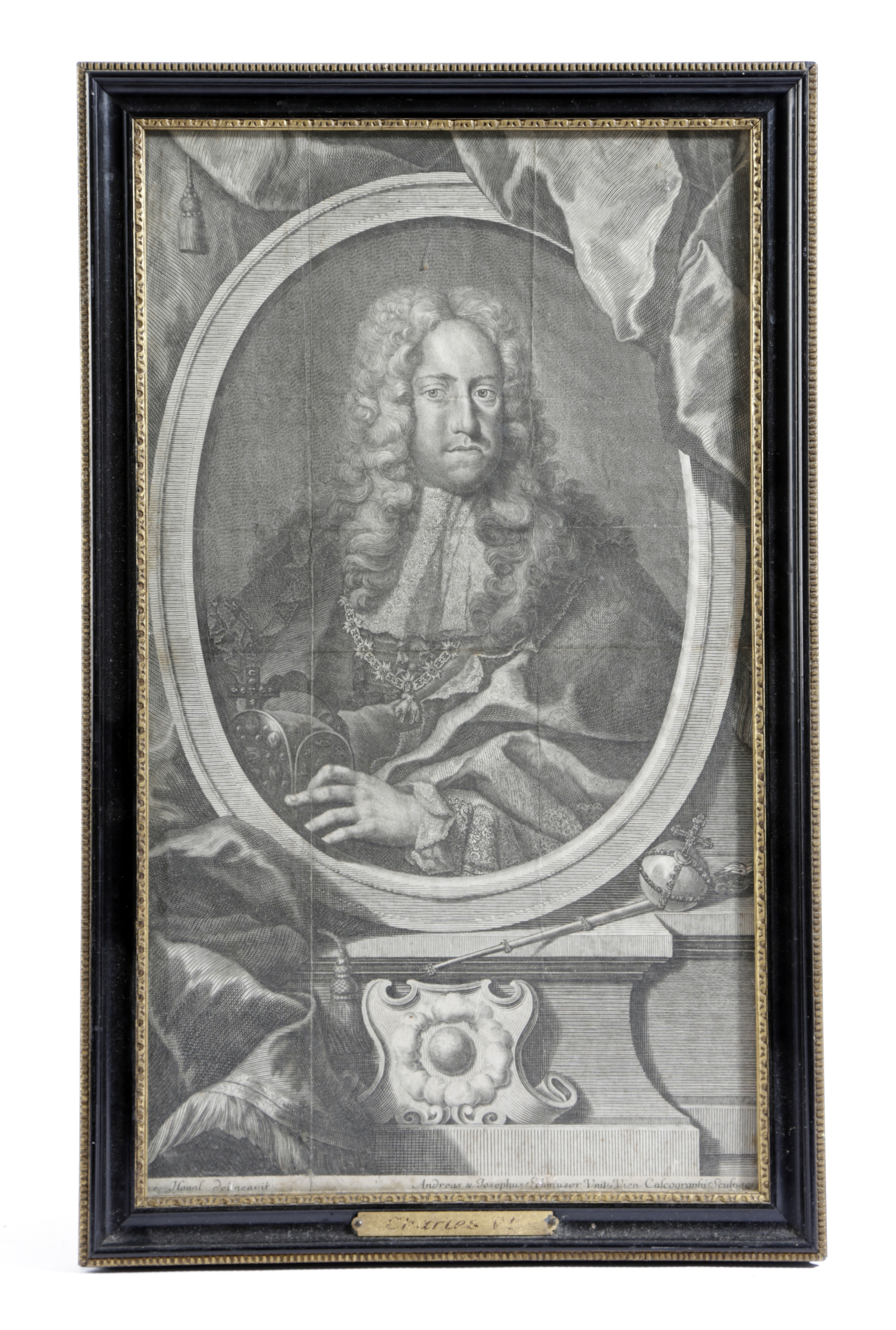 portraying 'The Right Honourable William Pitt Esq', 'Regina Anna D.G. Angliae Scotiae Franciae et Hibern.', 'Ernestus Gideon Baro de Laudon', 'Rudolphus L.D.G Romanorum Imperator', 'Justus Henningus Boehmerus', 'The Right Noble Charles Marquess of Rockingham', 'Leopoldus S.R.I. Comes de Daun', 'Franciscus I Roman. Imper.' and two others, each in a glazed Hogarth type frame, the backs with stencil marks for 'J. & W. VOKINS, MAKERS, 14, GREAT PORTLAND ST.' (10)