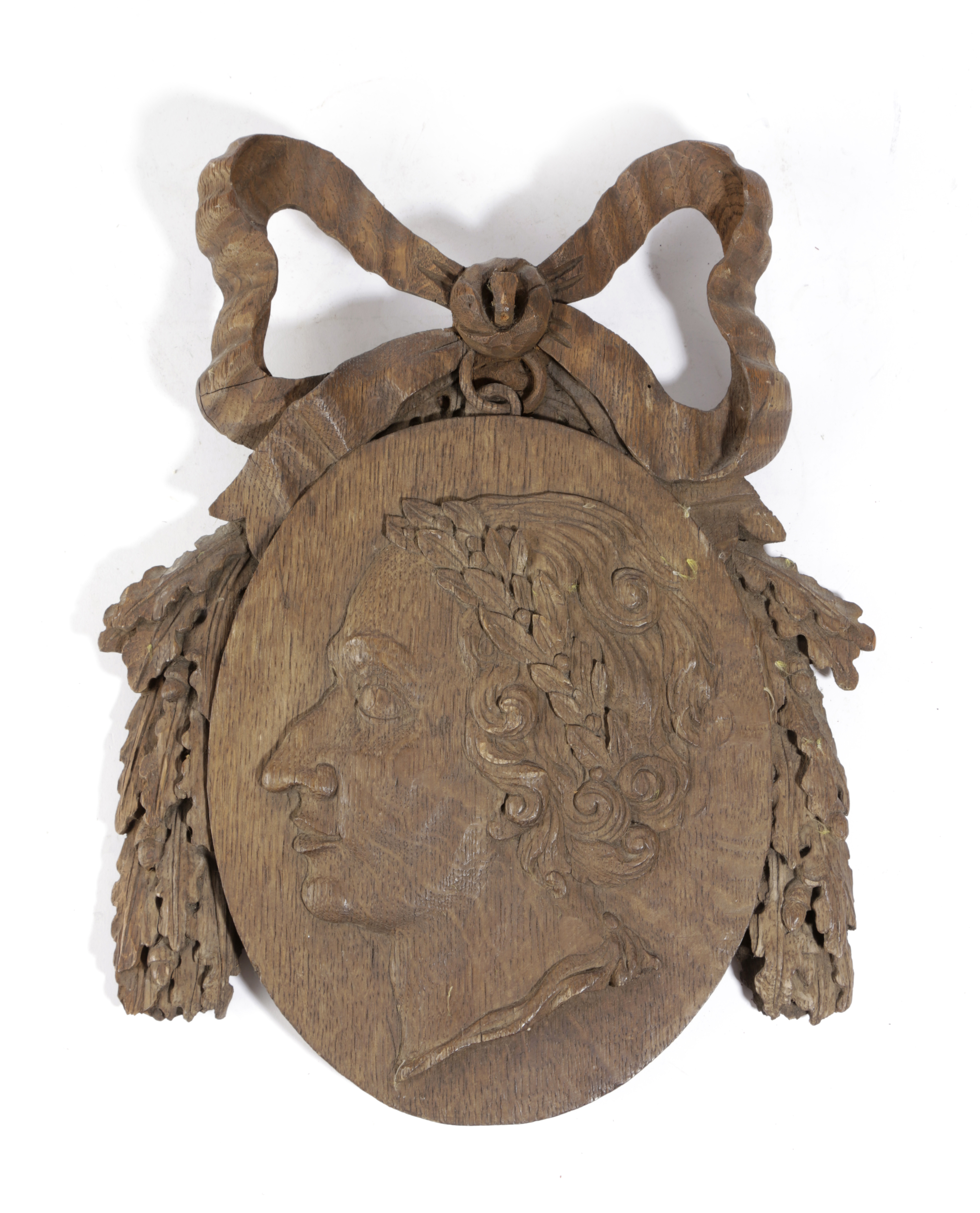 the central medallion with the profile of a Roman emperor, surmounted by ribbon tied oak leaves and acorns