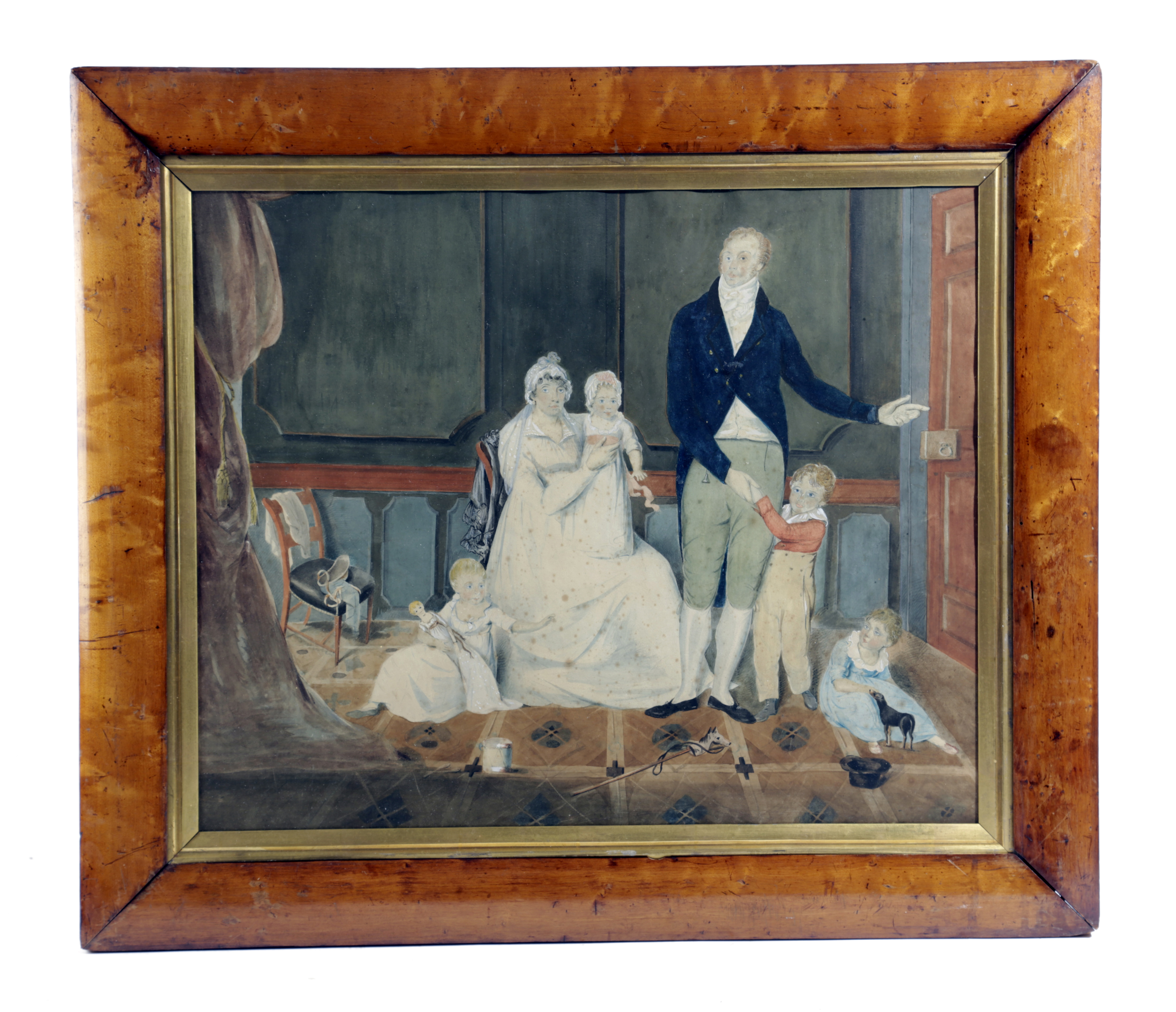 the parents with four chidlren and their toys, in a maple frame