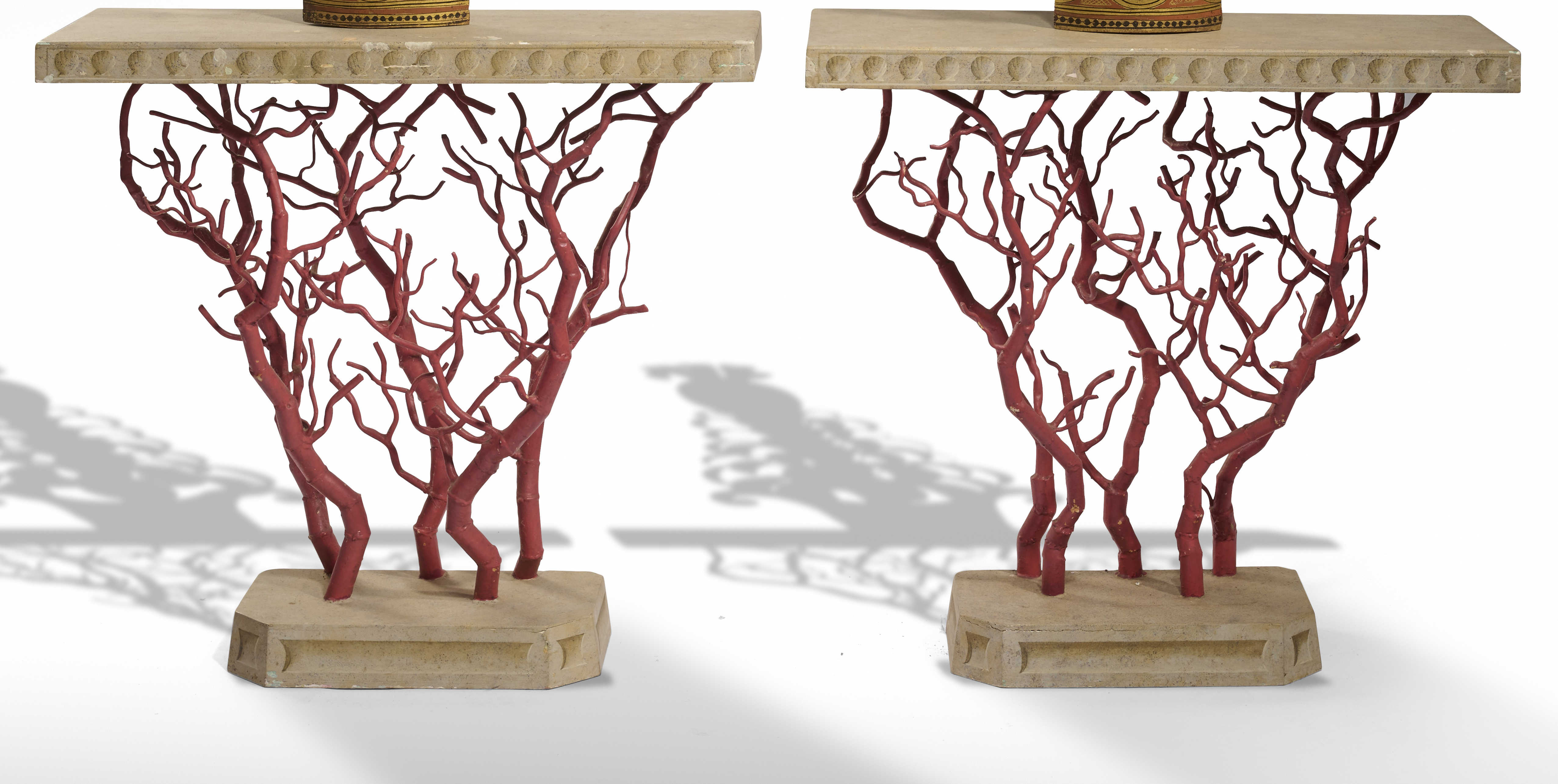 A PAIR OF PAINTED WOOD AND METAL CORAL CONSOLE TABLES