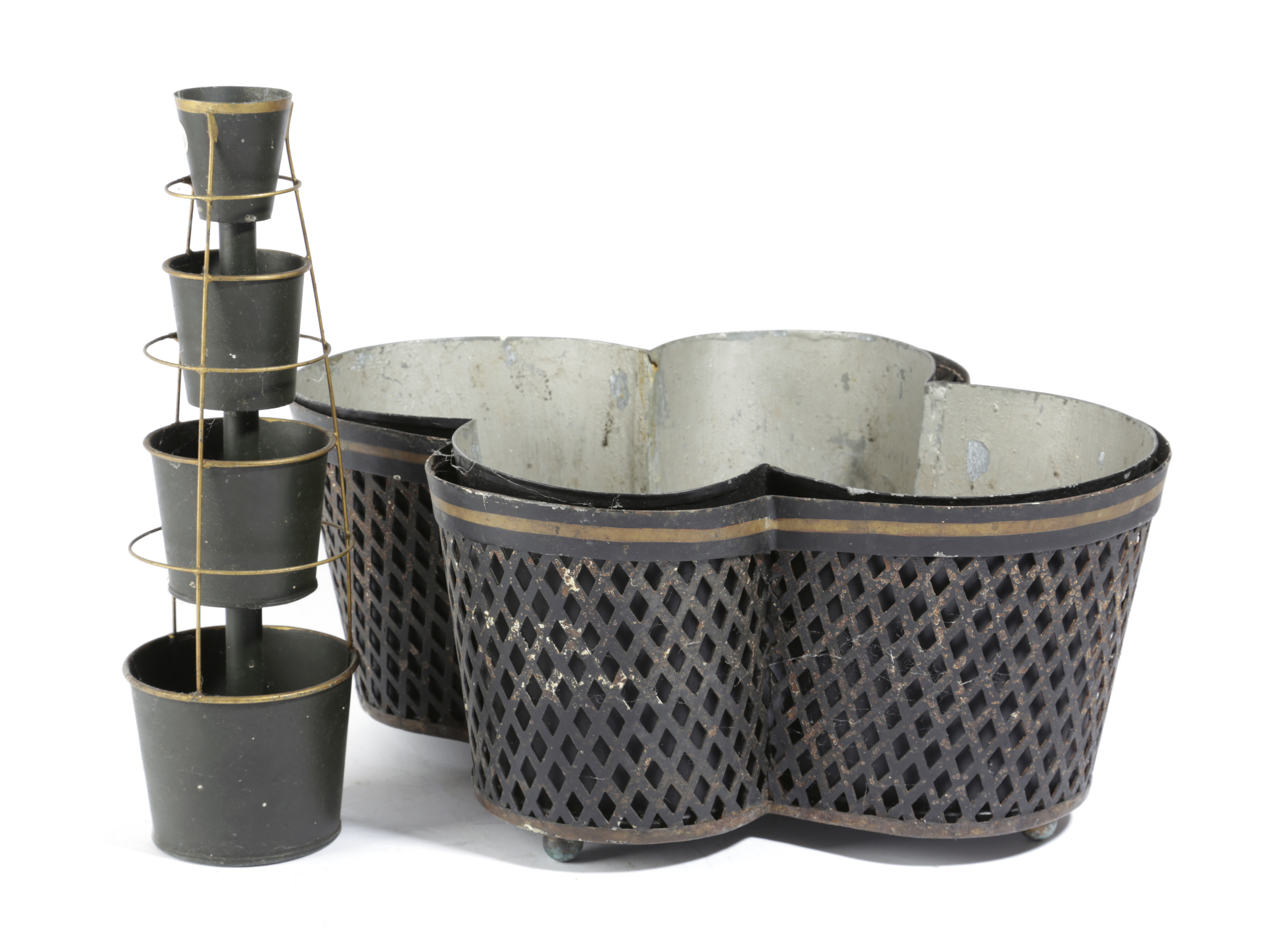 of quatrelobe form with pierced reticulated sides, together with a painted tôle peinte planter with four graduated circular tiers within a wire cage (2)