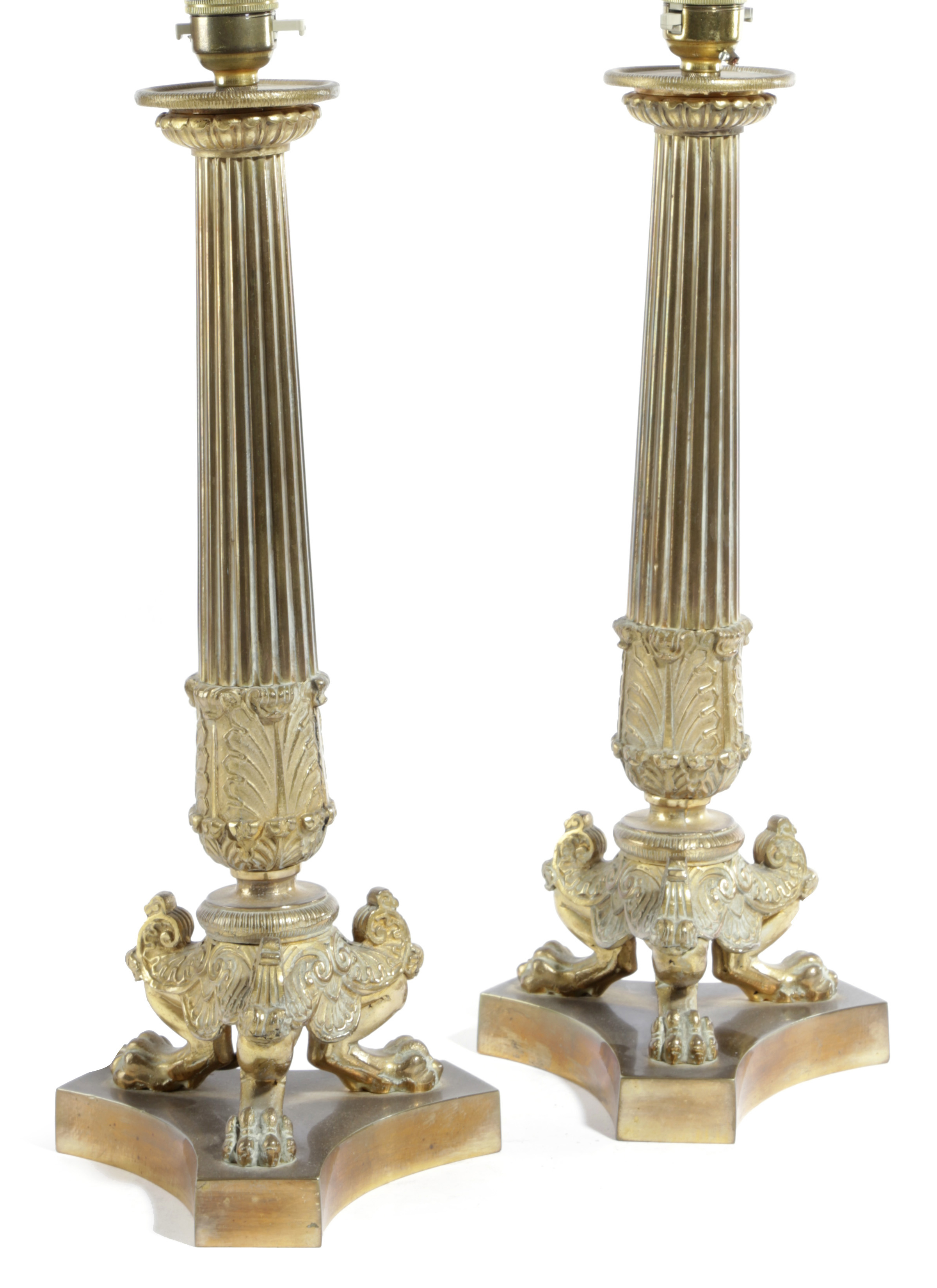 each with a reeded column on a lion's paw tripod base and a triangular foot, with shades (2)