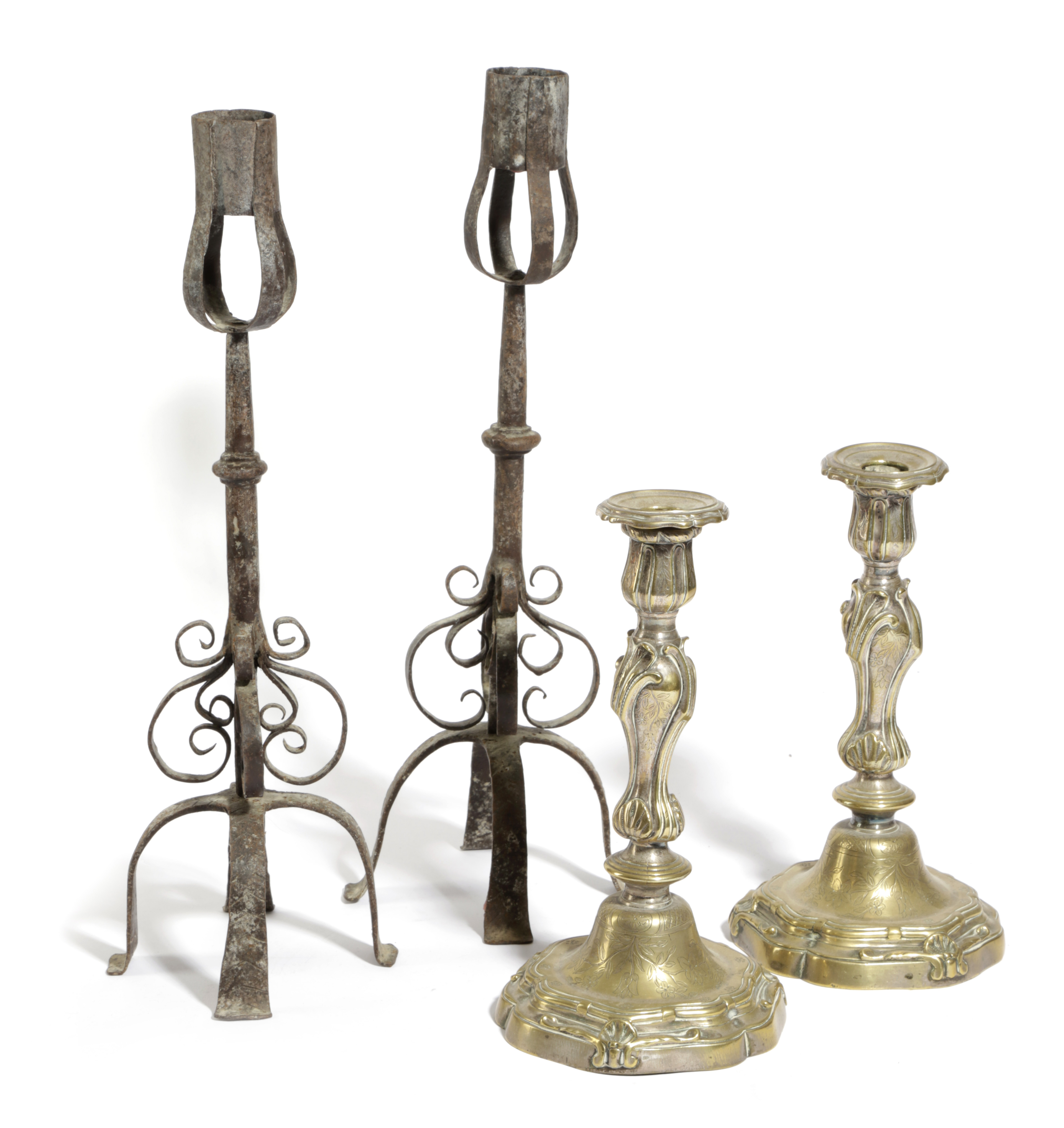 each with an urn shaped nozzle above a Rococo inverted baluster stem and a domed hexafoil base, engraved with trailing floral foliage, together with a pair of wrought iron candlesticks (4)
