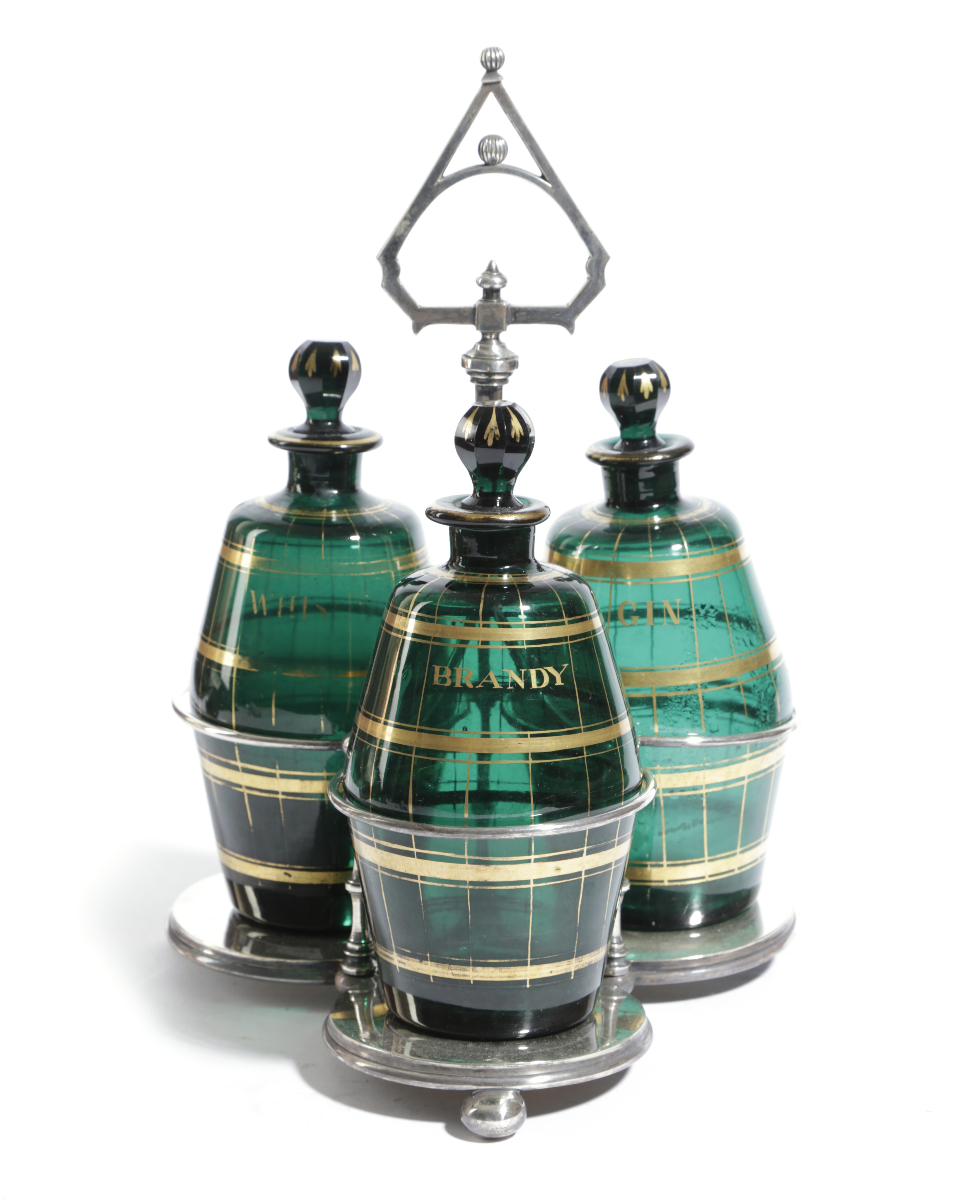 with gilt banded decoration and titled 'BRANDY', 'WHISKY' and 'GIN', in a later silver plated frame (4)