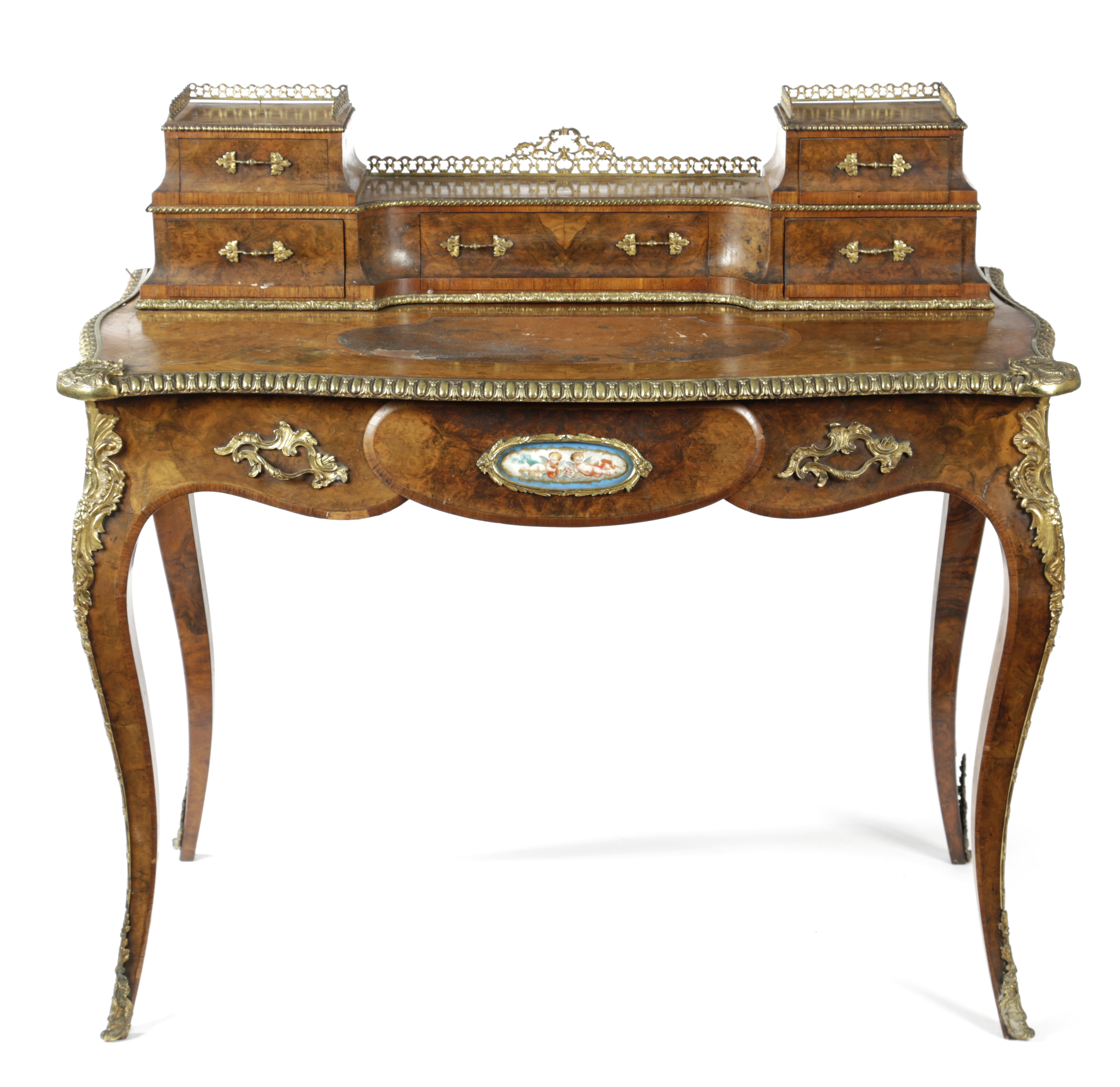 with ormolu mounts and an oval Sévres style plaque, the raised top with an arrangement of five drawers above a leather inset writing surface and a frieze drawer