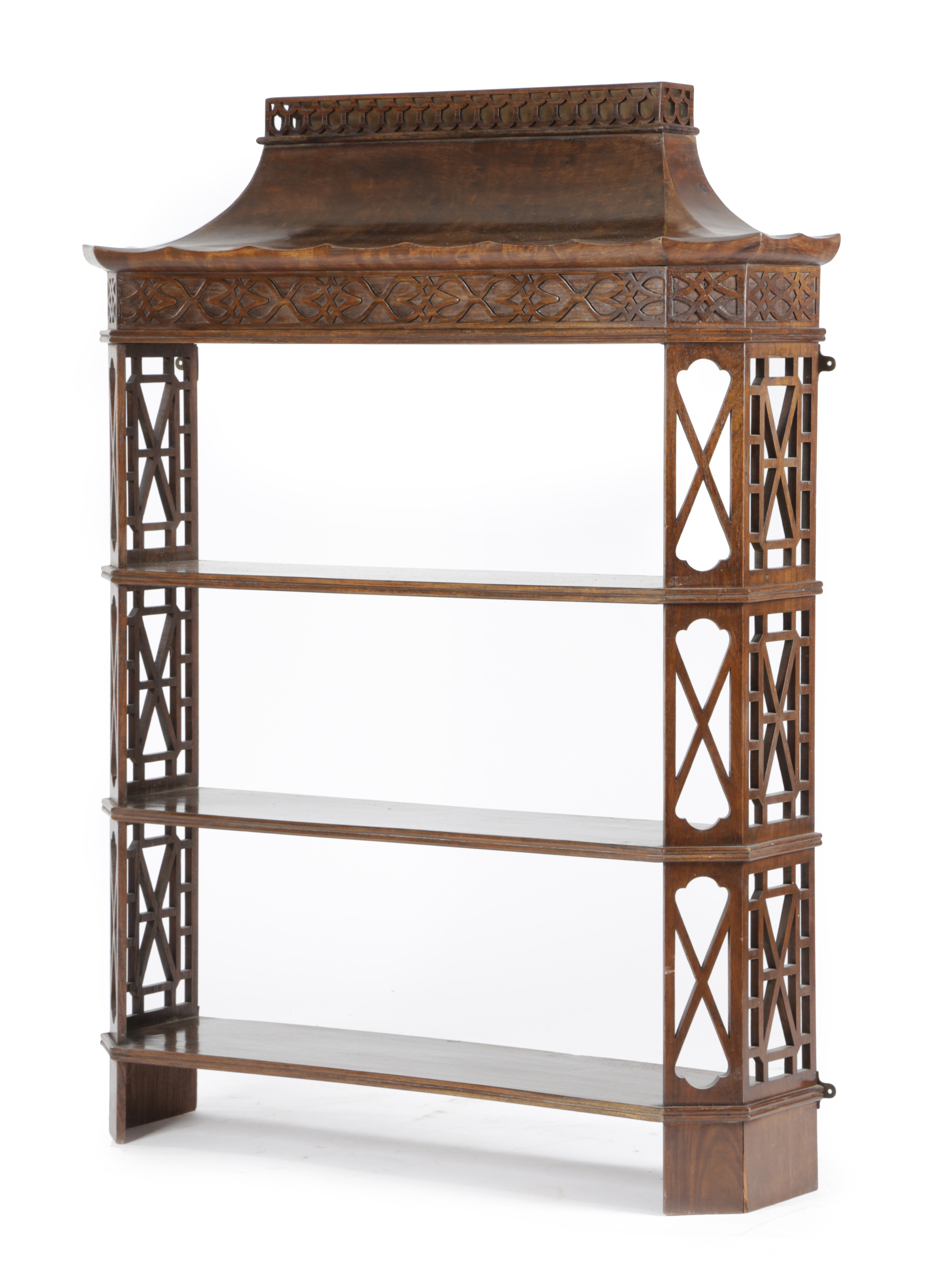 with pierced and blind fret decoration, the pagoda top above three open shelves