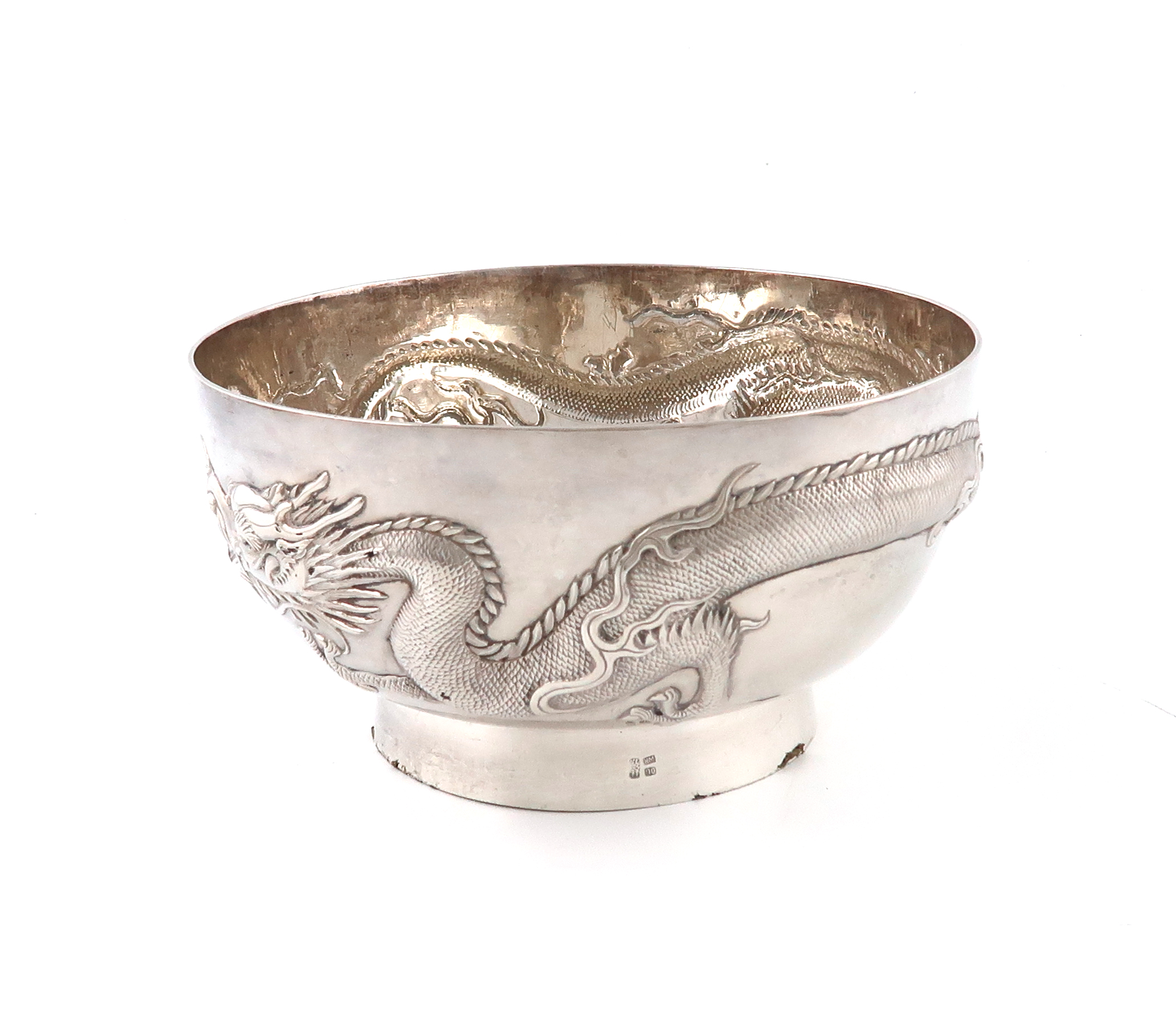 circular form, embossed with a large dragon, on a circular foot, diameter 18.5cm, approx. weight 19oz.