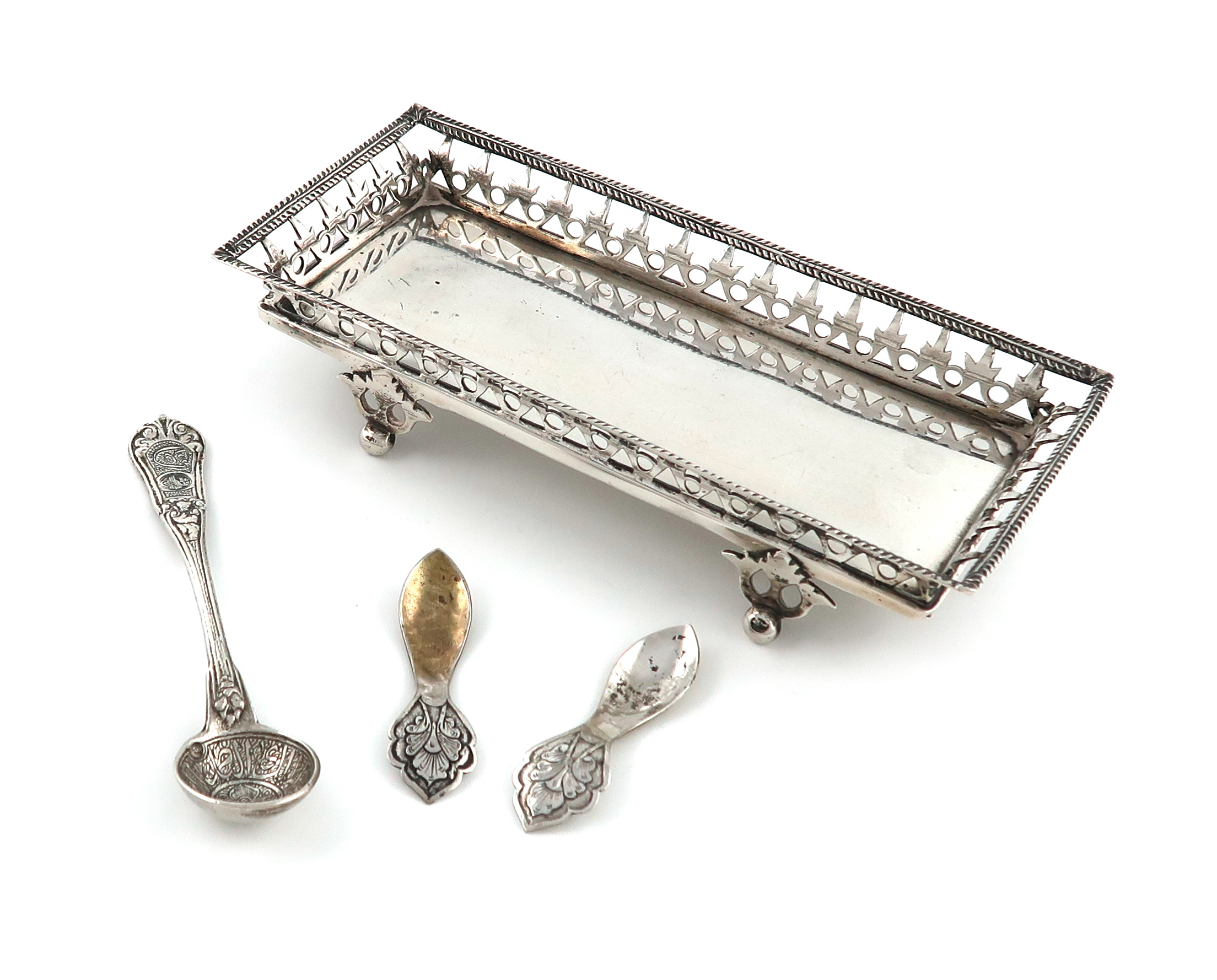 marked with an assay scape, rectangular form, pieced gallery and chevron border, on four pierced bracket feet, length 17.2cm, plus a Turkish silver spoon, the bowl with chased decoration, and two small metalware spoons, with foliate handles, approx. weighable 6oz. (4)