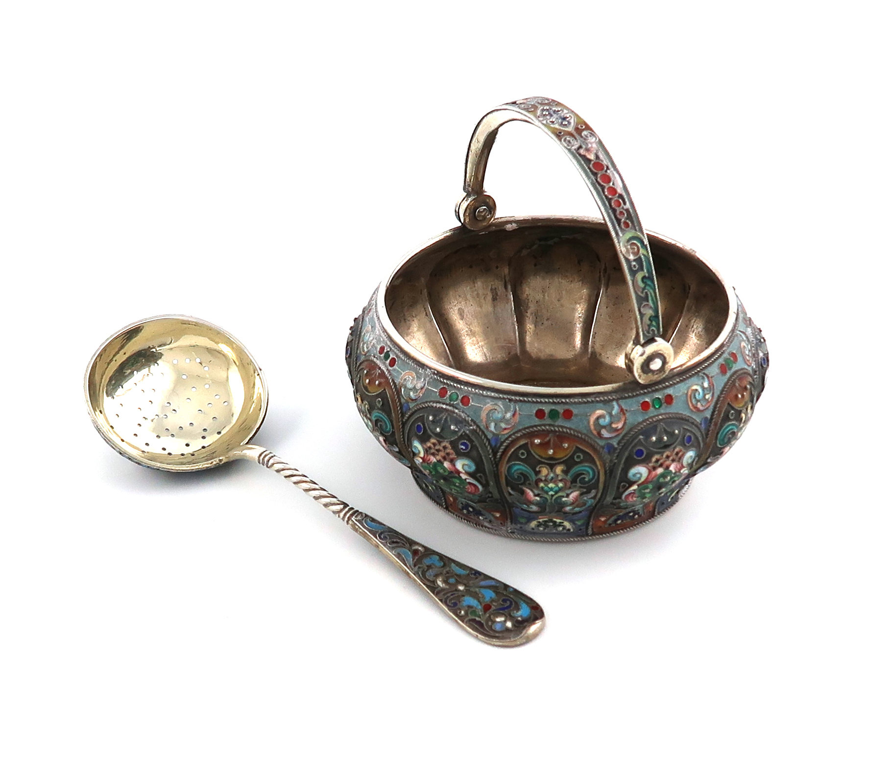 lobed circular form, with polychrome enamelled foliate decoration, rope-work borders, swing-handle, with traces of gilding, the sugar spoon with a pierced silver-gilt bowl, height 10cm, approx. weight 7oz. (2)