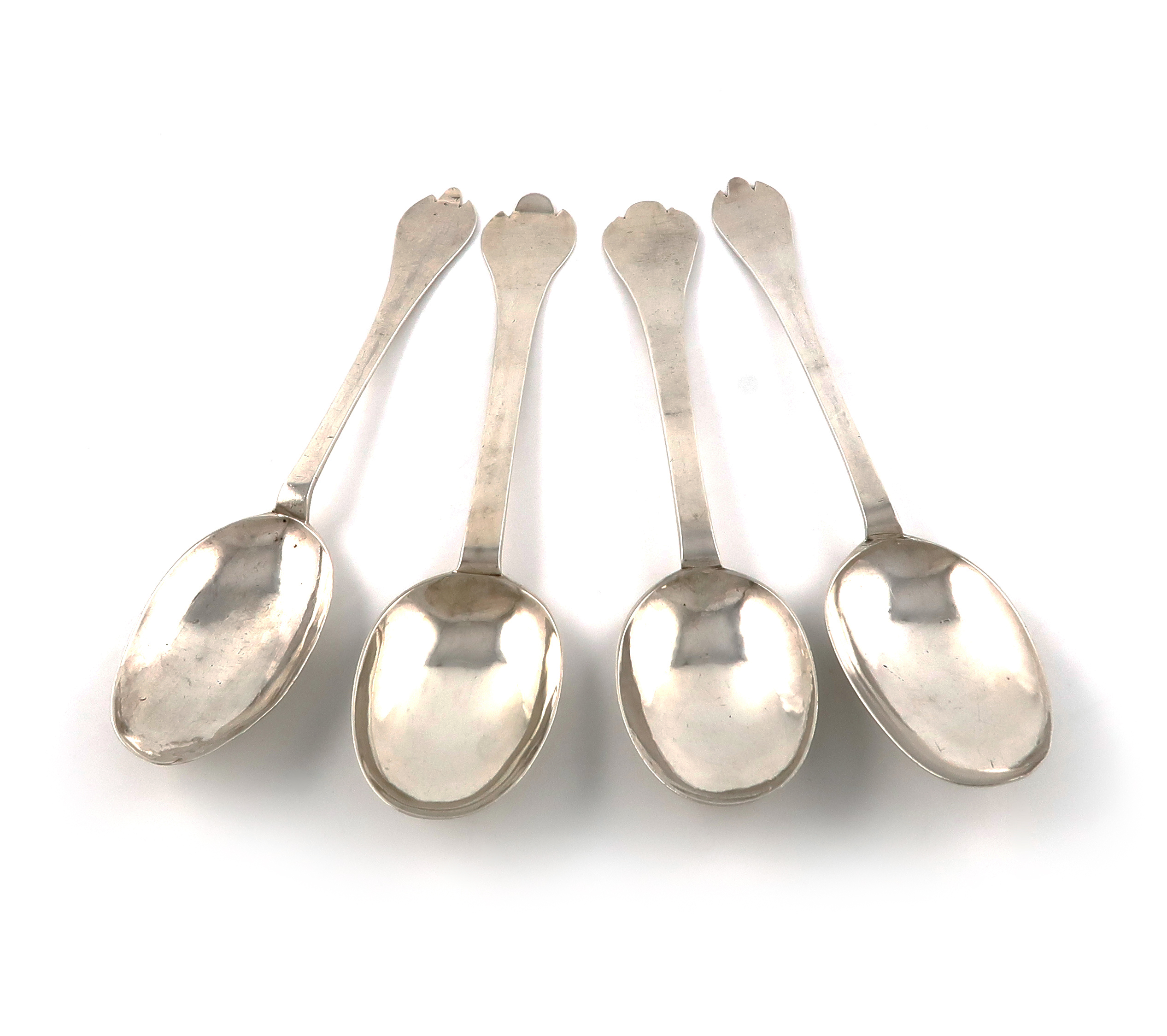 the reverse of the oval bowls with plain rat-tails, the reverse of the terminals scratch initialled 'T' over 'WM', length 19.9cm, plus two George I provincial silver Trefid spoons, one Exeter 1714, maker's mark worn, the reverse of the oval bowl with a beaded rat-tail and the reverse of the terminal with worn prick-dot initials and date 'EM' over 'S' over '1715', length 20.6cm, the other Exeter, date letter worn, with prick dot initials and dated 1721, total approx. weight 6.5oz. (4)
