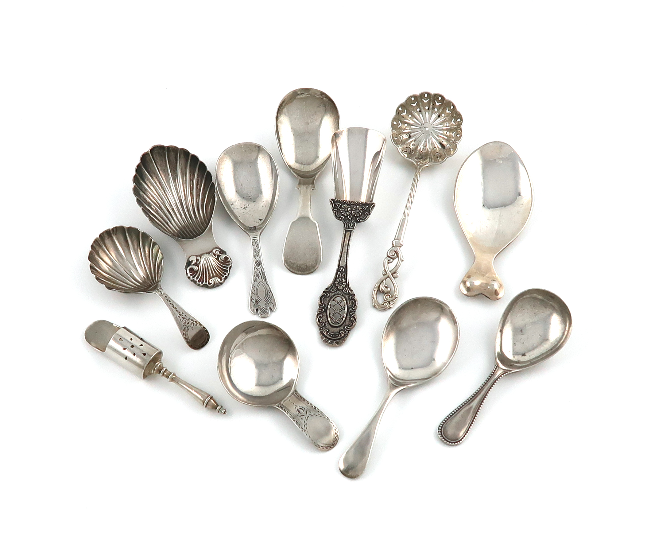 comprising silver items: one George III Fiddle pattern, Newcastle 1808, one George IV with shell formed bowl and Bright-cut decoration, by William Bateman, one George III with Bright-cut decoration, one Bead pattern, one Old English pattern, one with a shell formed bowl and shell thumbpiece, one modern Trefid pattern, one modelled as a stylised fish, plus a late-Victorian sugar sifting spoon, an Edwardian sugar sifting spoon, and a continental caddy spoon, total approx. weighable 5oz. (11)