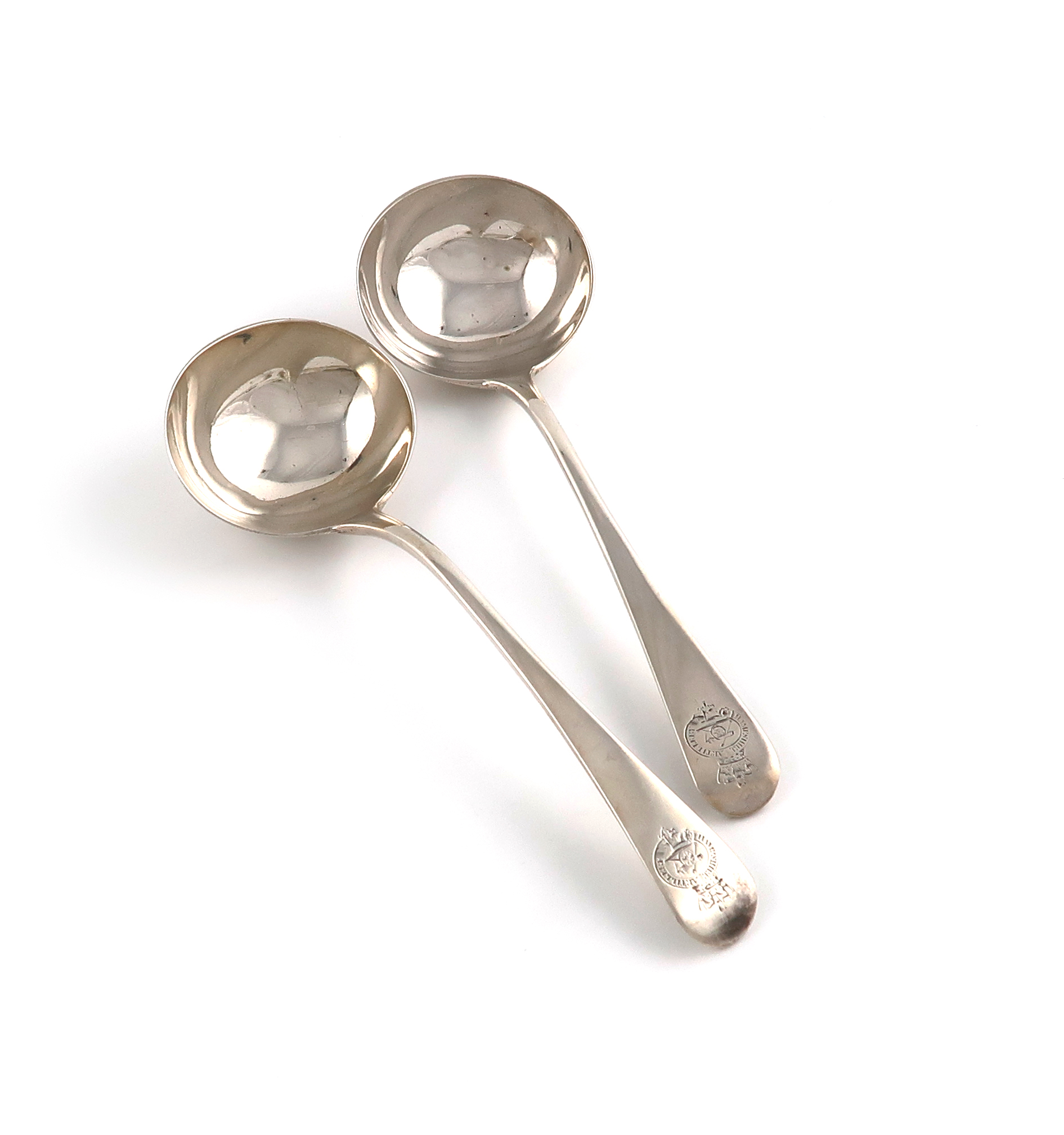 A pair of George III regimental silver Old English pattern sauce ladles, Hampshire Artillery Volunteers,