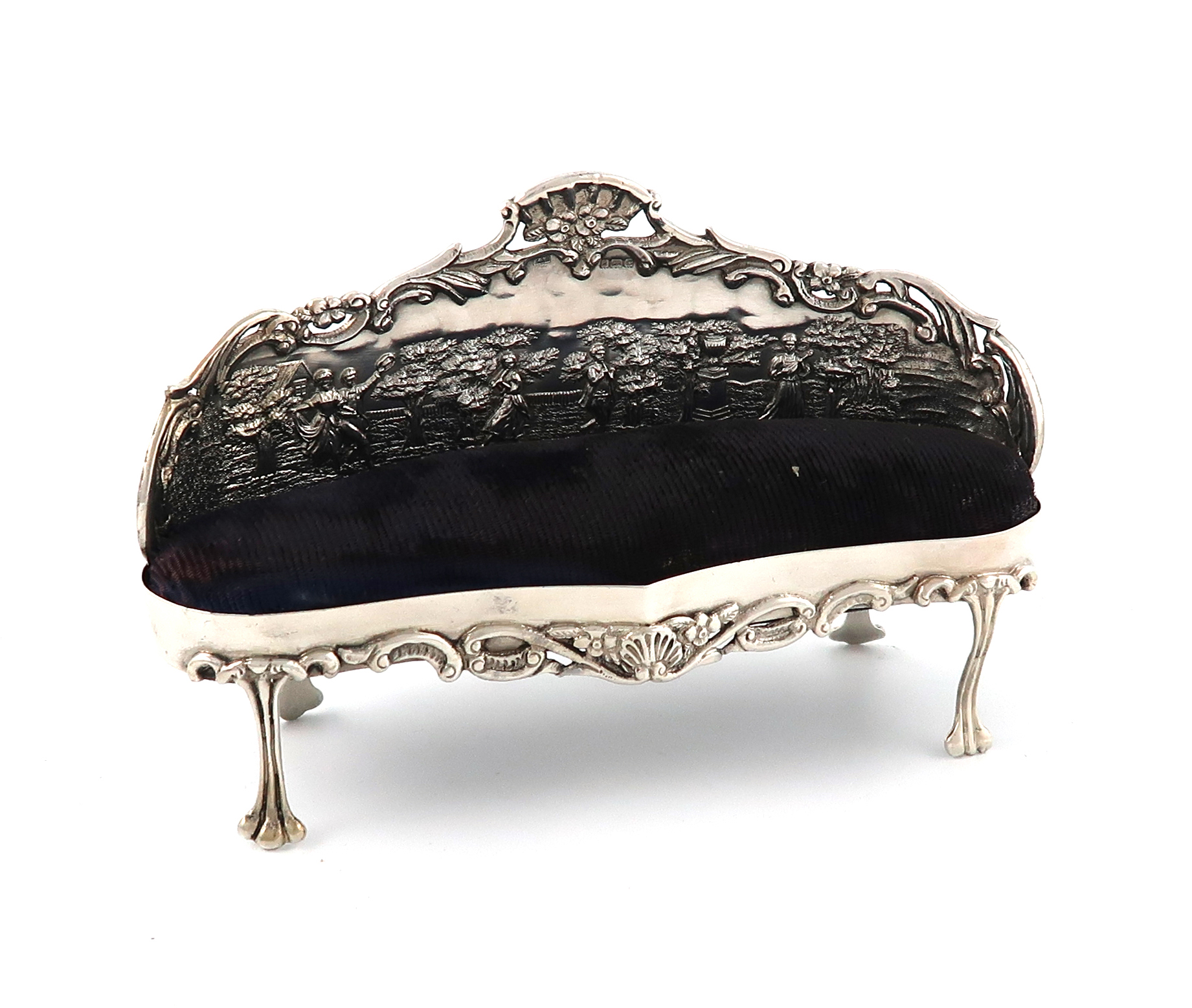 embossed figural scenes in landscape settings, cushioned seat, for four fluted legs, length 15.5cm.
