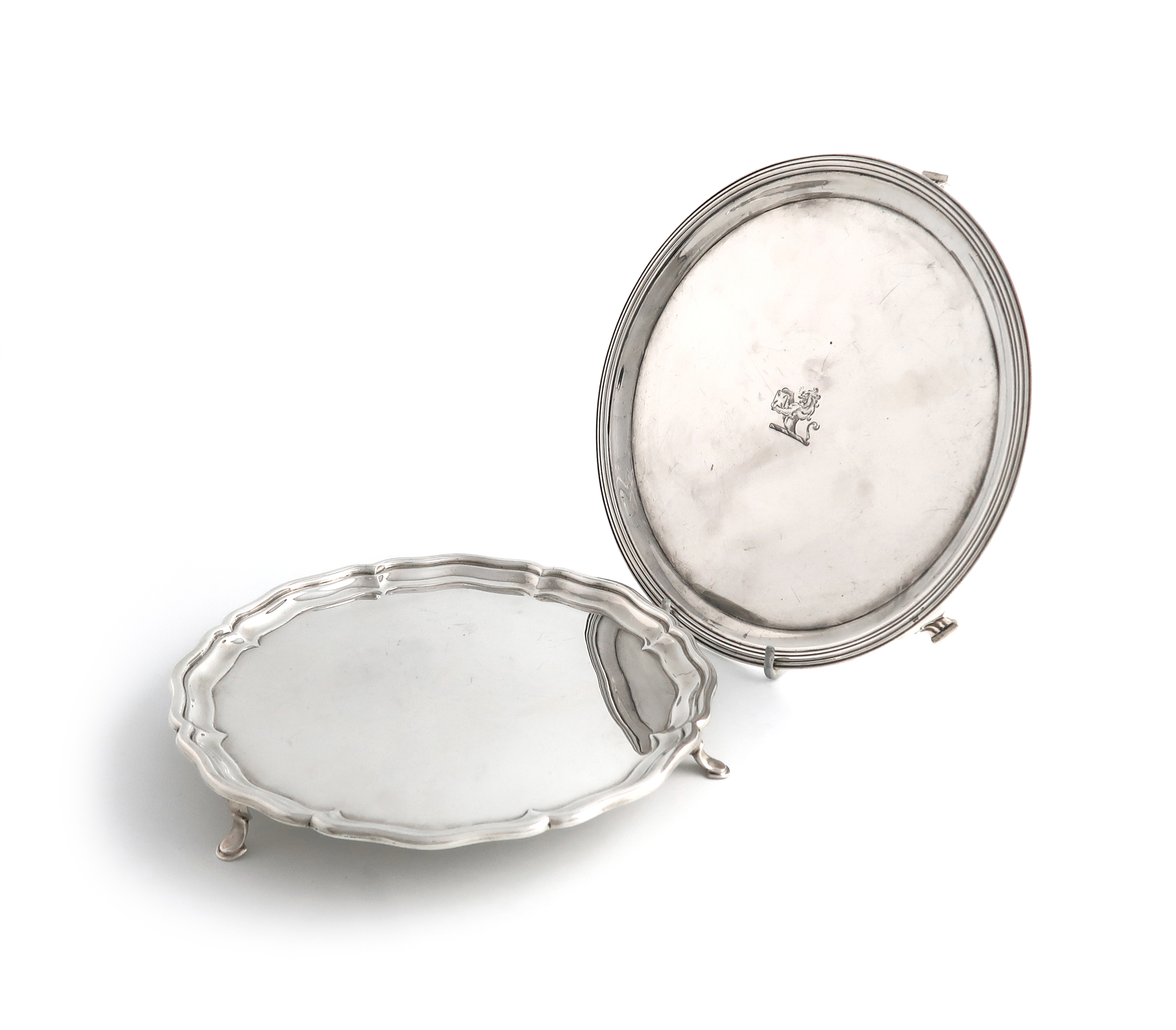 circular form, reeded border, the centre with a crest, on three bracket feet, diameter 20.4cm, plus a small silver salver, by Hawksworth, Eyre & Co Ltd, London 1913, circular form, moulded border, on three pad feet, diameter 19.5cm, total approx. weight 23.9oz. (2)