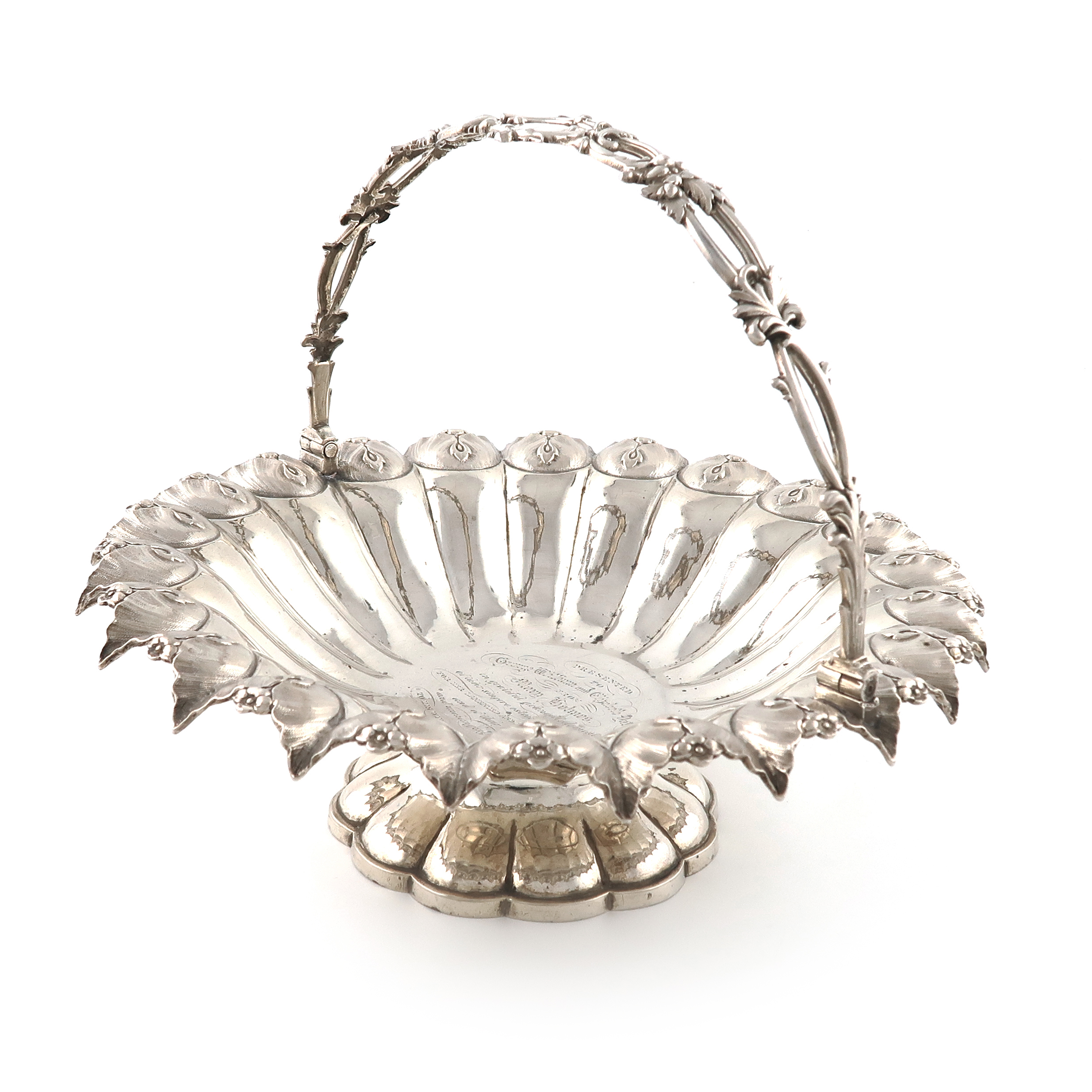 circular fluted form, foliate border, pierced foliate swing-handle, with a presentation inscription, on a lobed circular foot, diameter 26.5cm, approx. weight 19oz.
