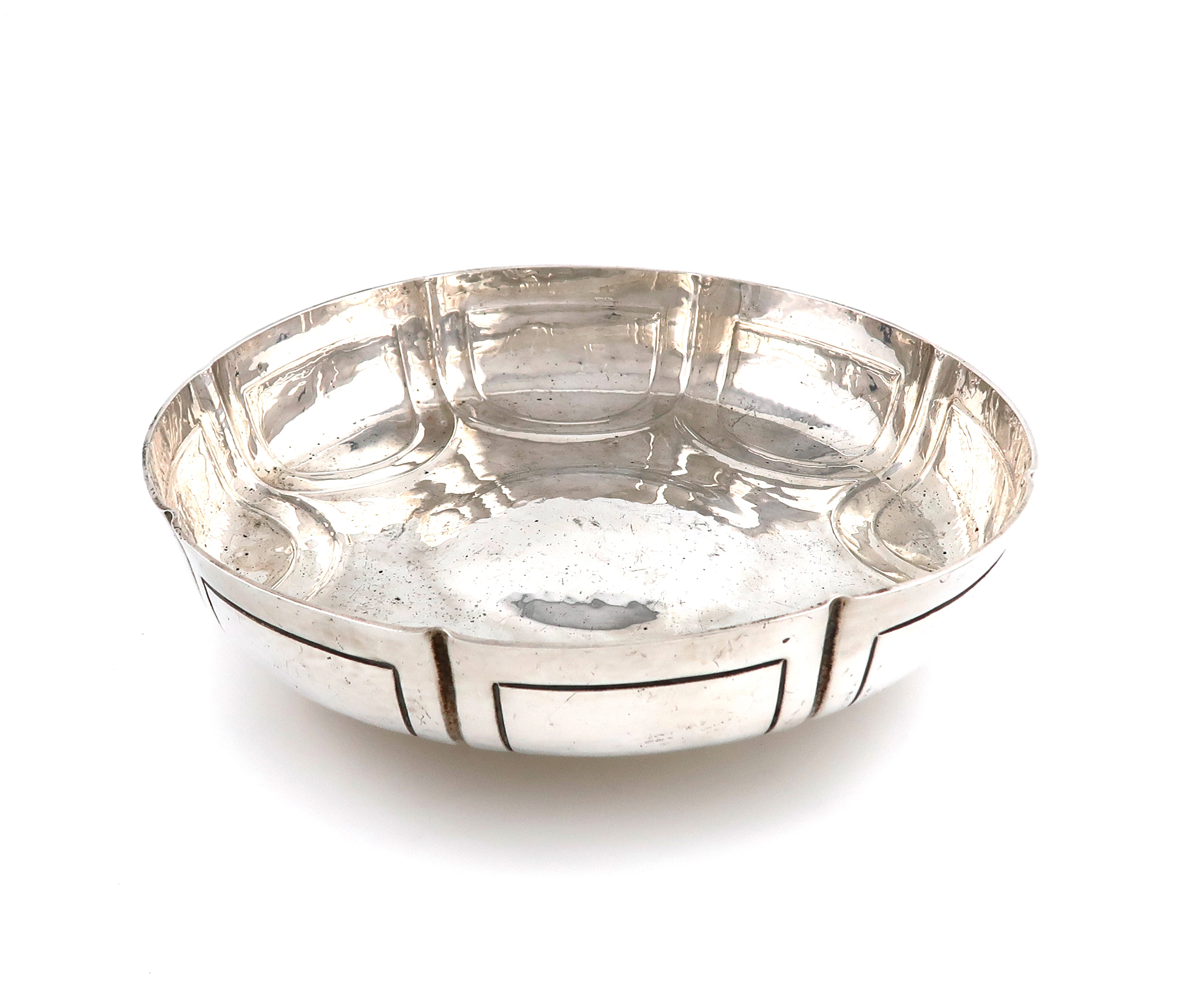 circular lobed form, spot-hammered decoration with embossed demi-lunes, on a raised circular lobed foot, diameter 26cm, approx. weight 32.7oz.