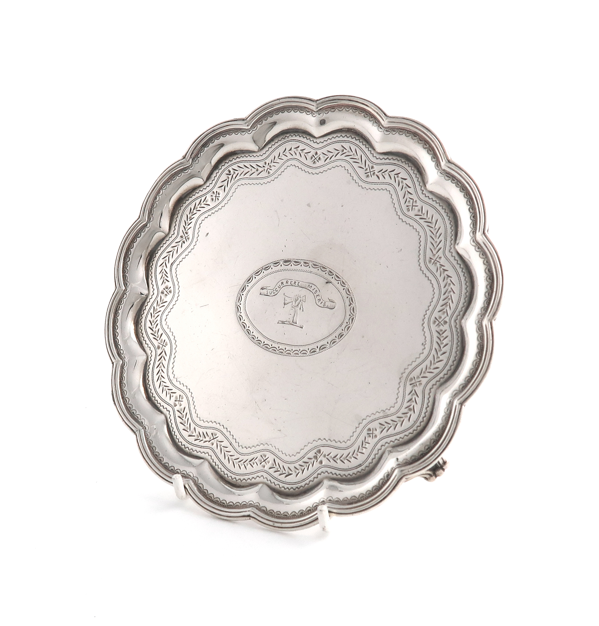 circular lobed form, bright-cut decoration to the centre and rim, reeded borders, engraved with a crest and motto, the underside with scratch weight 7'5, on three bracket feet, diameter 15.8cm, approx. weight 7oz.