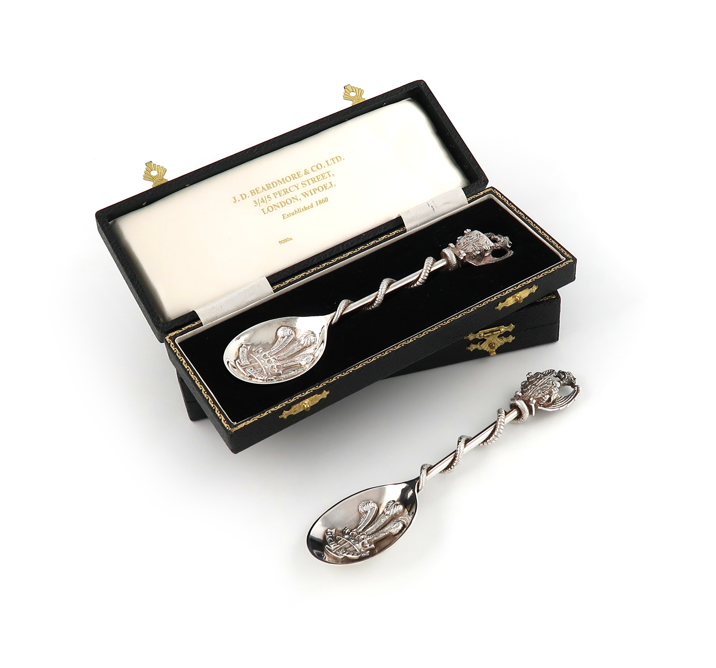 Designed by Norman Manwaring for J. D. Beardmore and Co., two modern silver commemorative spoons, Prince of Wales Investiture of 1969,