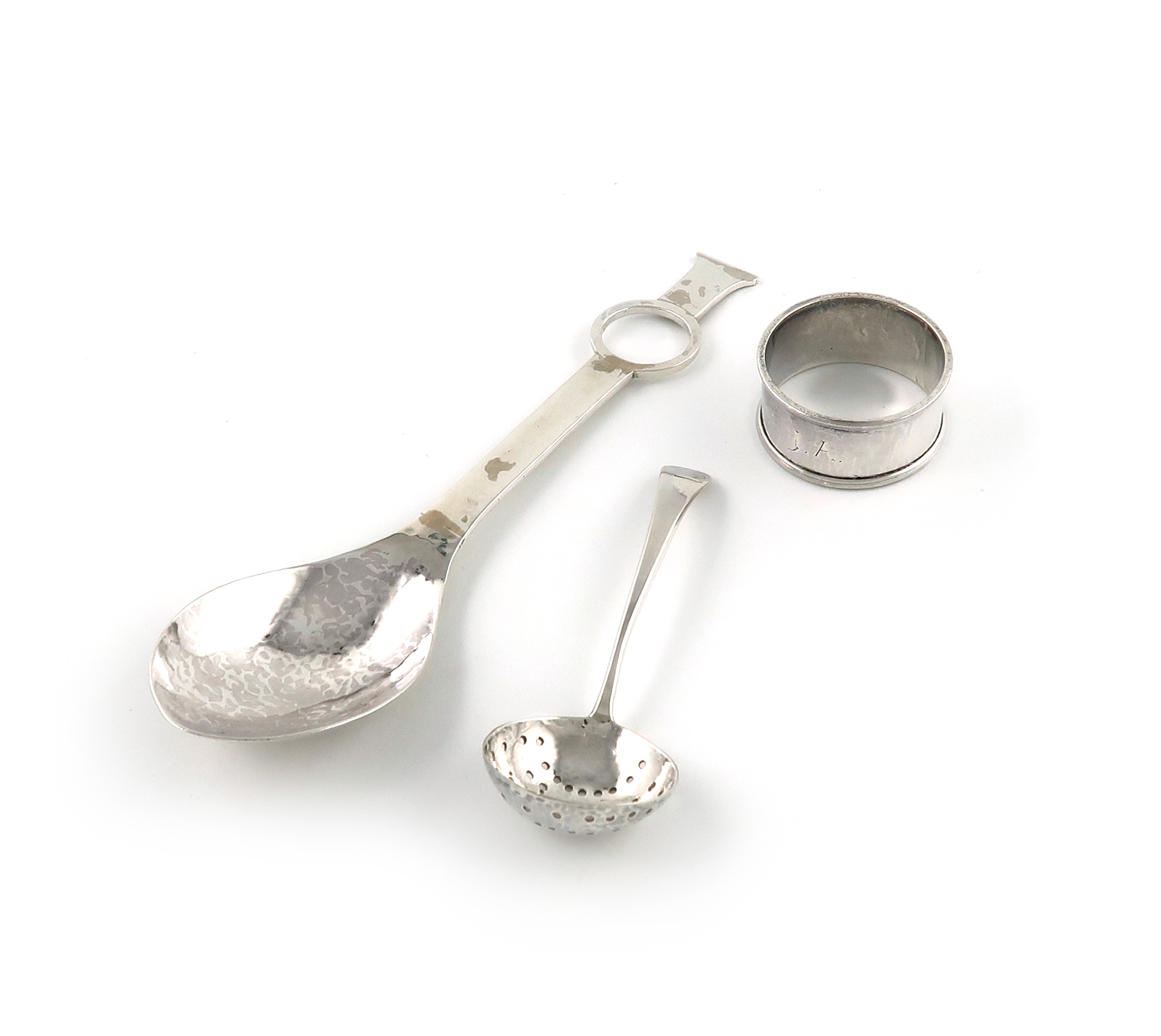 spot-hammered bowl, the stem with a pierced circle, length 20.9cm, plus a napkin ring and sugar sifting spoon by Harry Warmington, London 1956 and 1958, approx. total weight 4.4oz. (3)