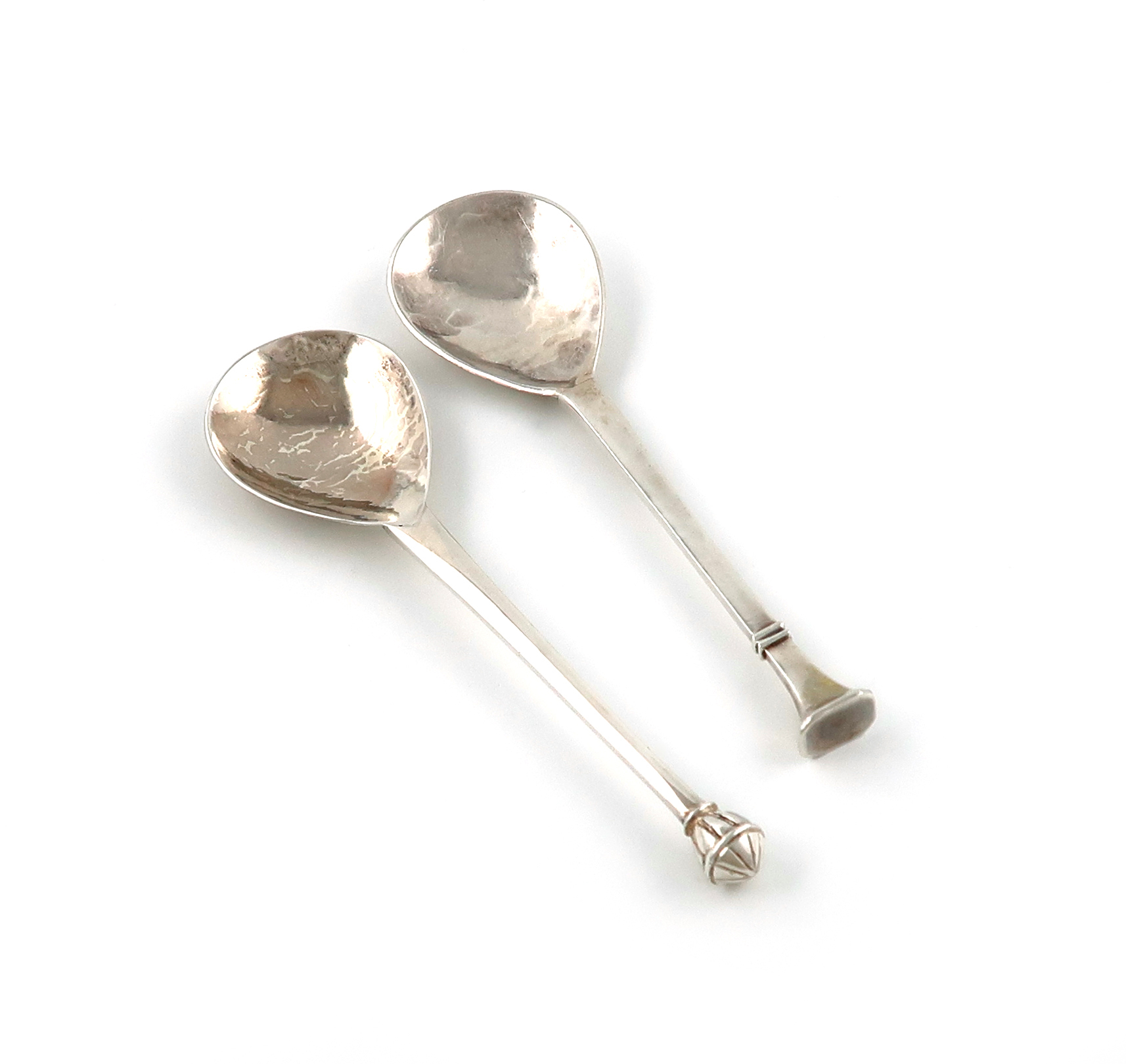 fig-shaped bowls, tapering stems, one with a panelled cone finial, the other with a rectangular seal-top, lengths 14.5cm and 14.2cm, approx. weight 2.6oz. (2)
