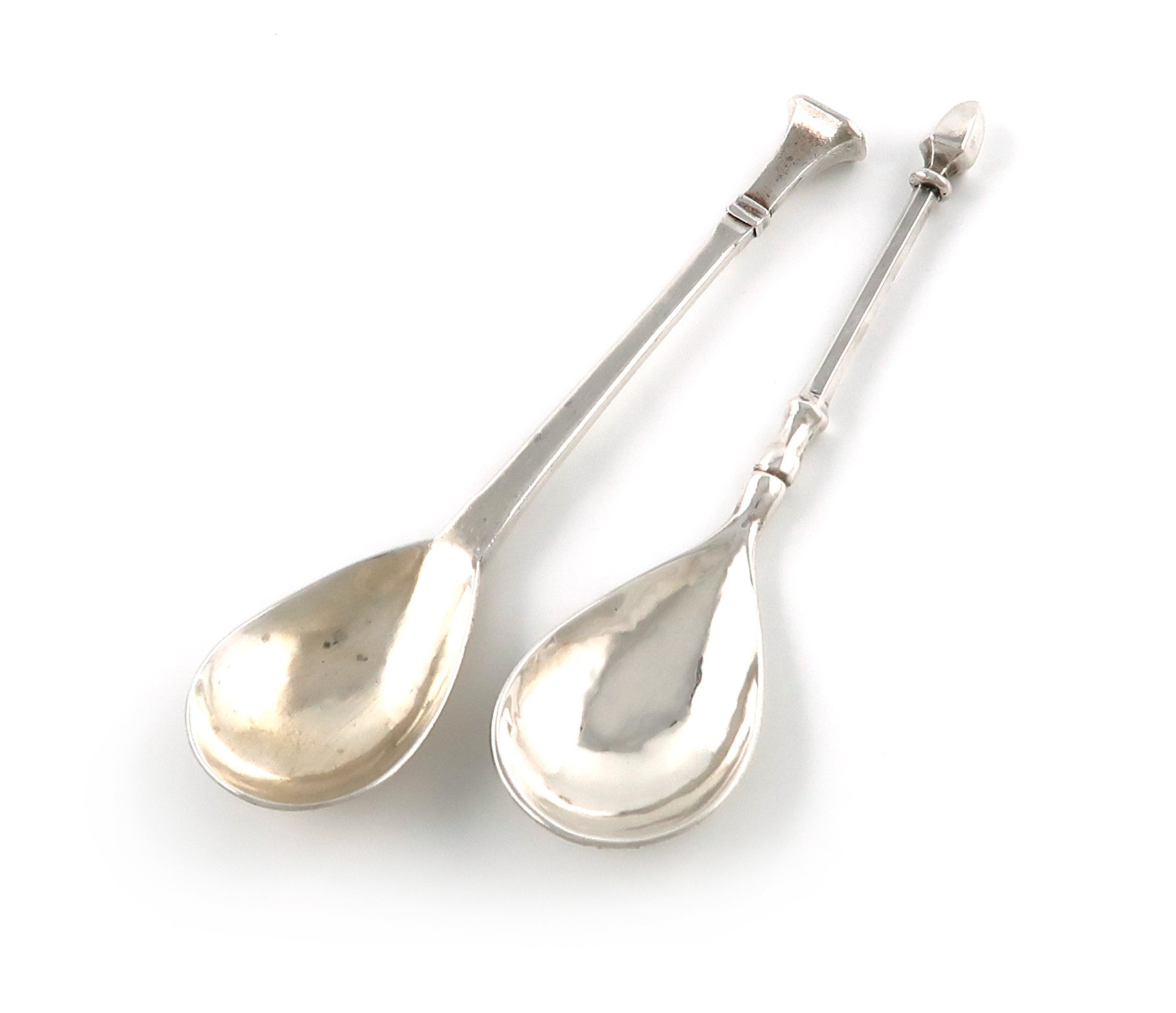 fig-shaped bowls, tapering stems, one with a panelled cone finial, the other with a rectangular seal-top, lengths 14cm and 13.8cm, approx. weight 2.3oz. (2)