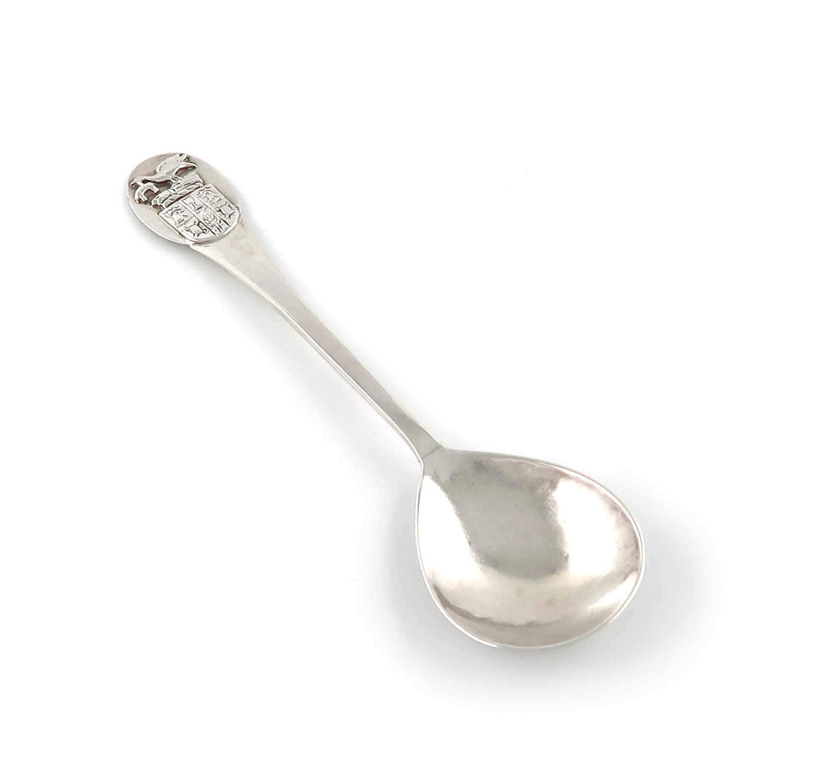 spot-hammered fig-shaped bowl, with a plain rat-tail, the terminal with the arms of Chipping Campden, length 16cm, approx. weight 1.1oz.