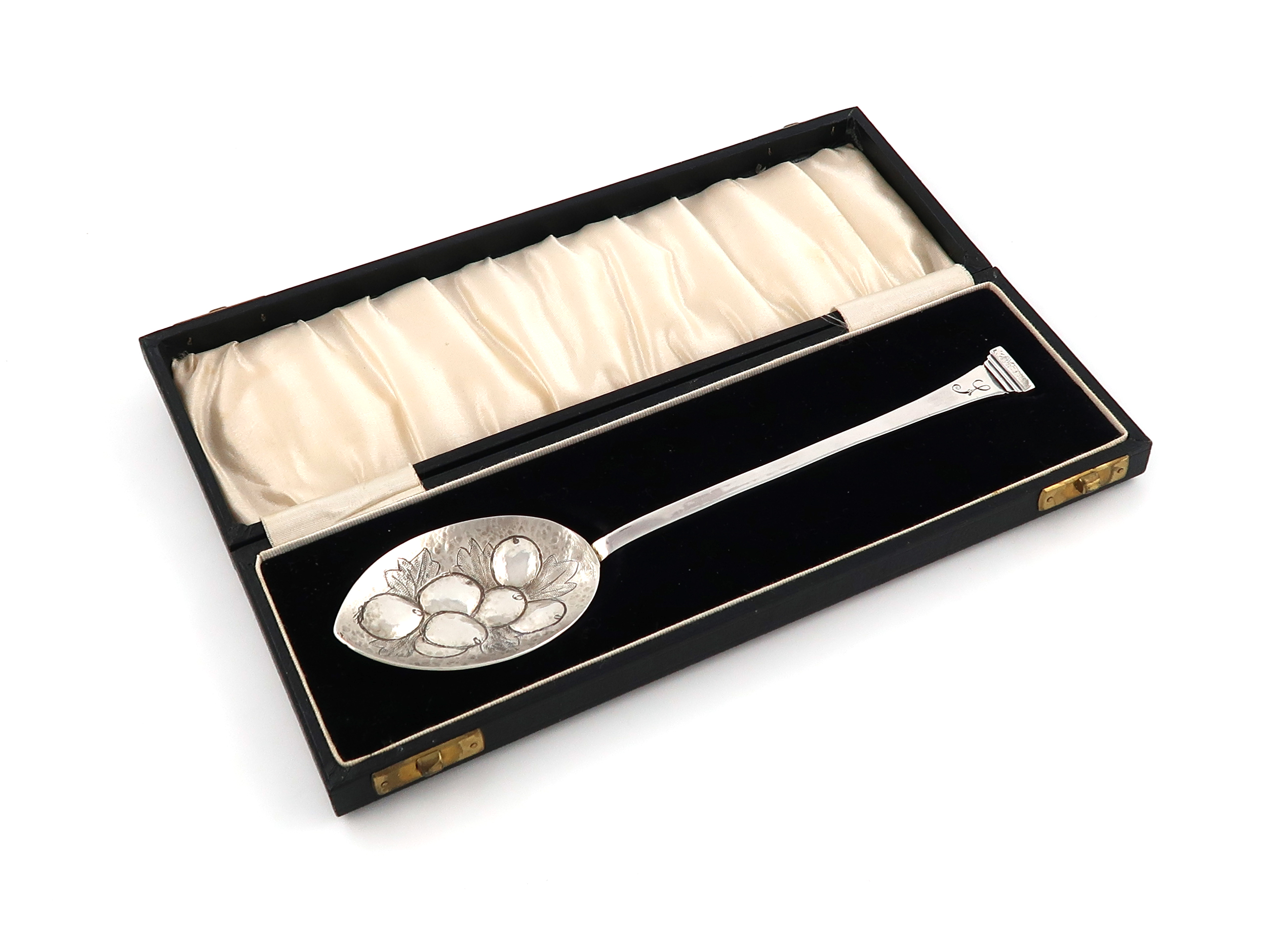 the bowl with embossed decoration, tapering handle with a stylised seal-top finial, initialled, in a fitted case, length 21.2cm, approx. weight 1.8oz.