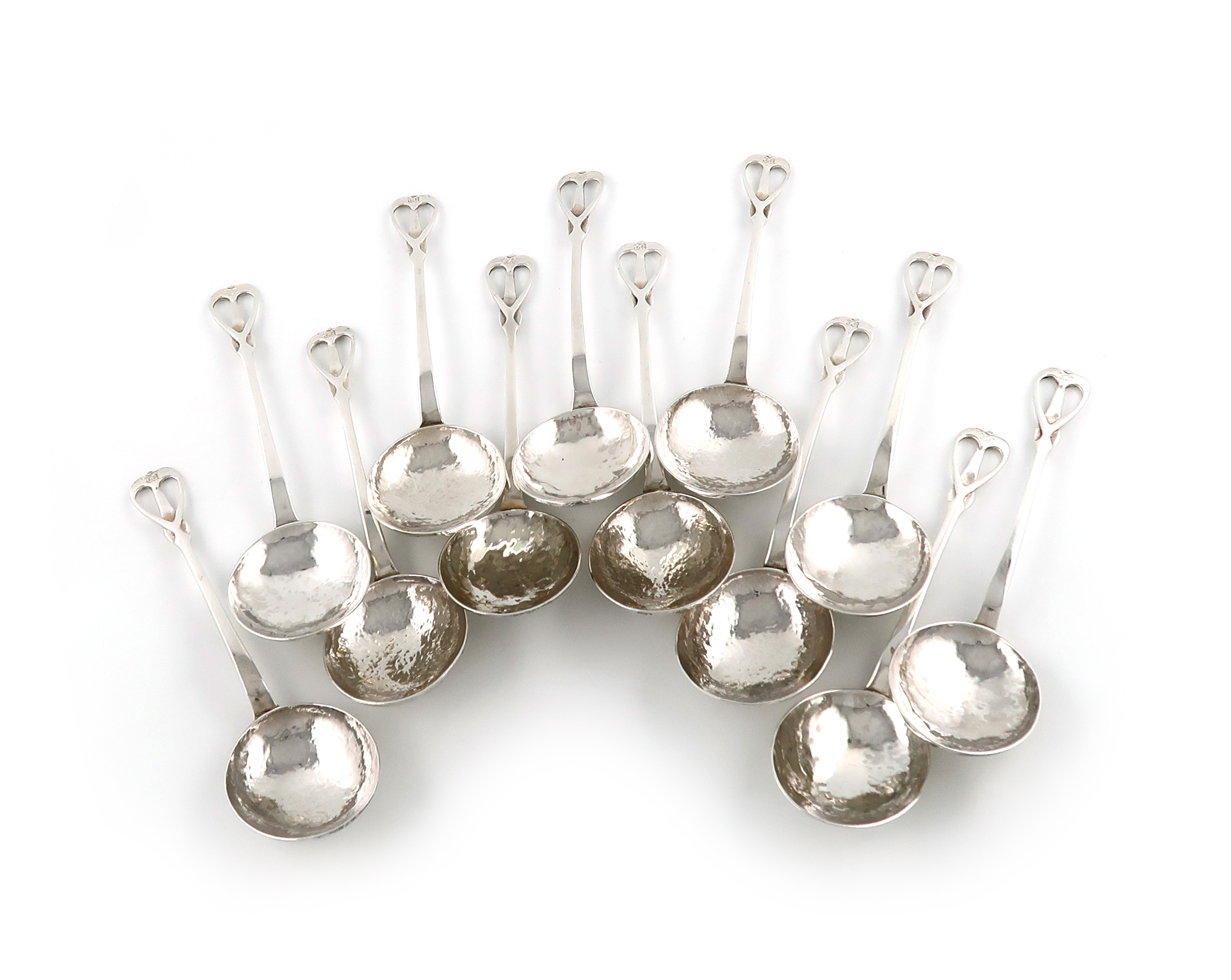 By Winifred King and Co., a matched set of twelve Arts and Crafts silver soup spoons,