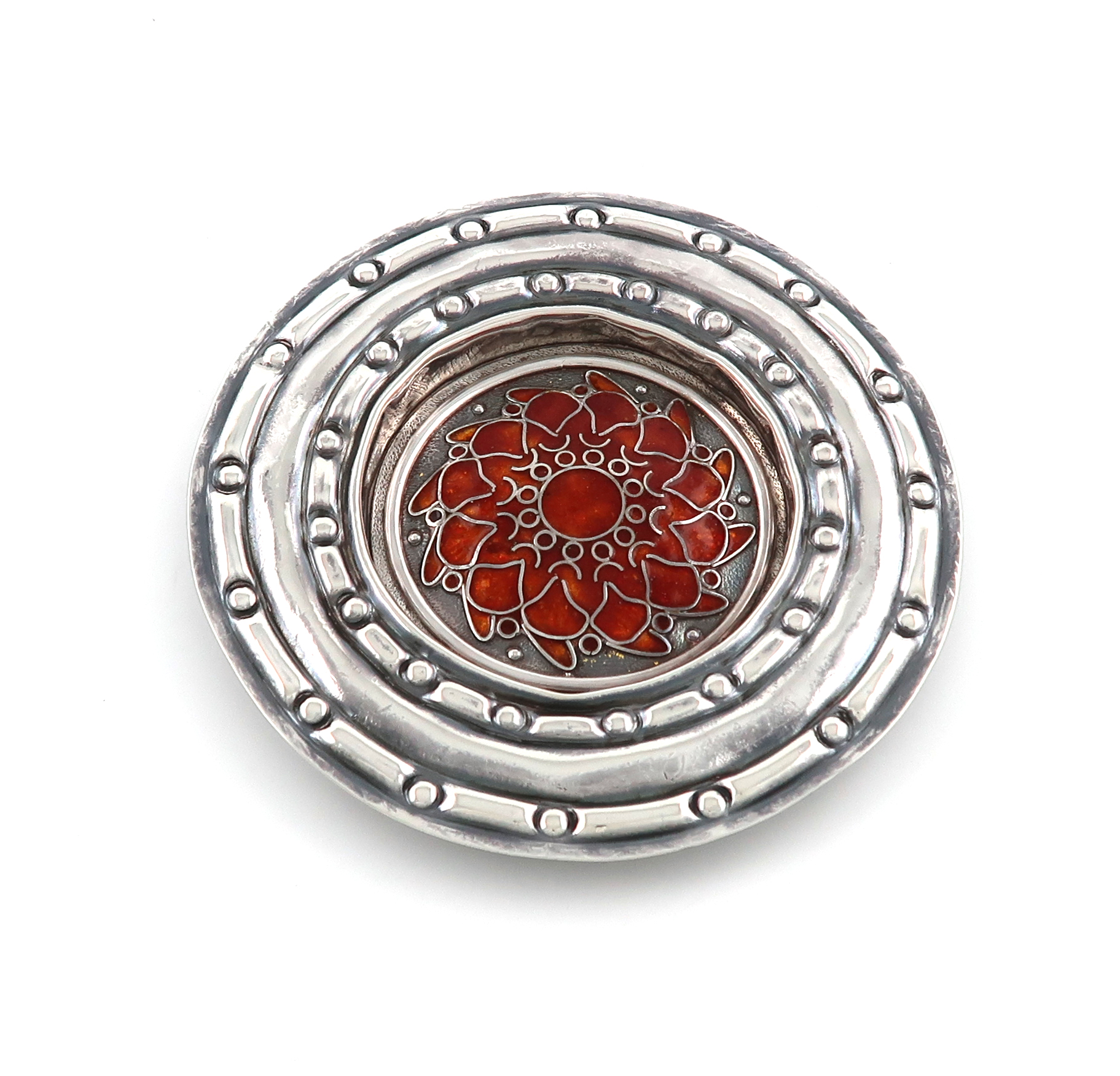 circular form, with dark orange enamel decoration, punch bead decoration, diameter 13.3cm, approx. weight 4.3oz.