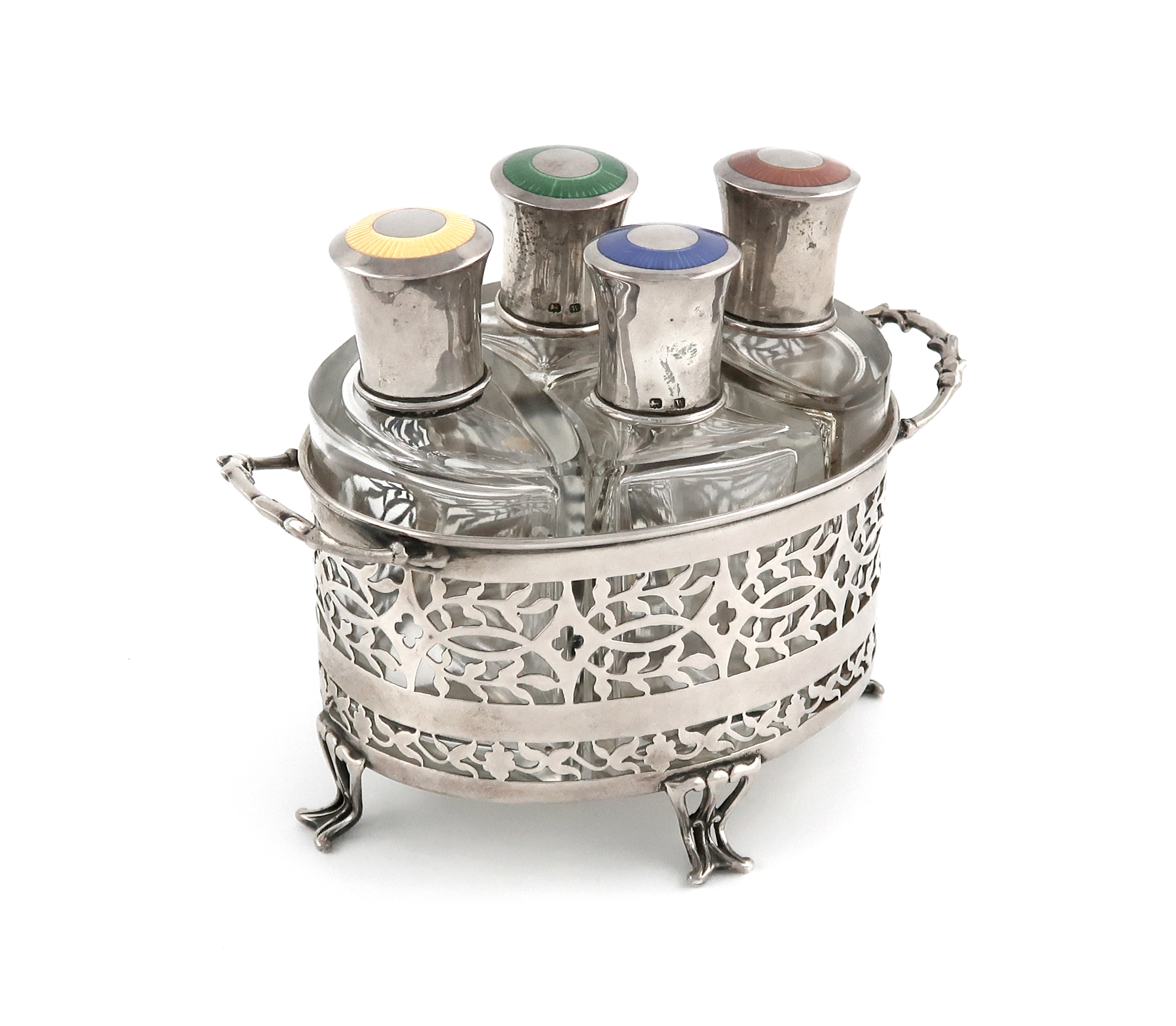 oval form, the frame with pierced decoration, twin scroll handles, on four pierced bracket feet, with four silver-mounted glass scent bottles with glass stoppers, (two mounts loose), the covers with blue, yellow, green and orange enamel decoration (one cover, Birmingham 1922), length handle to handle 12.3cm, approx. weighable 3.4oz.
