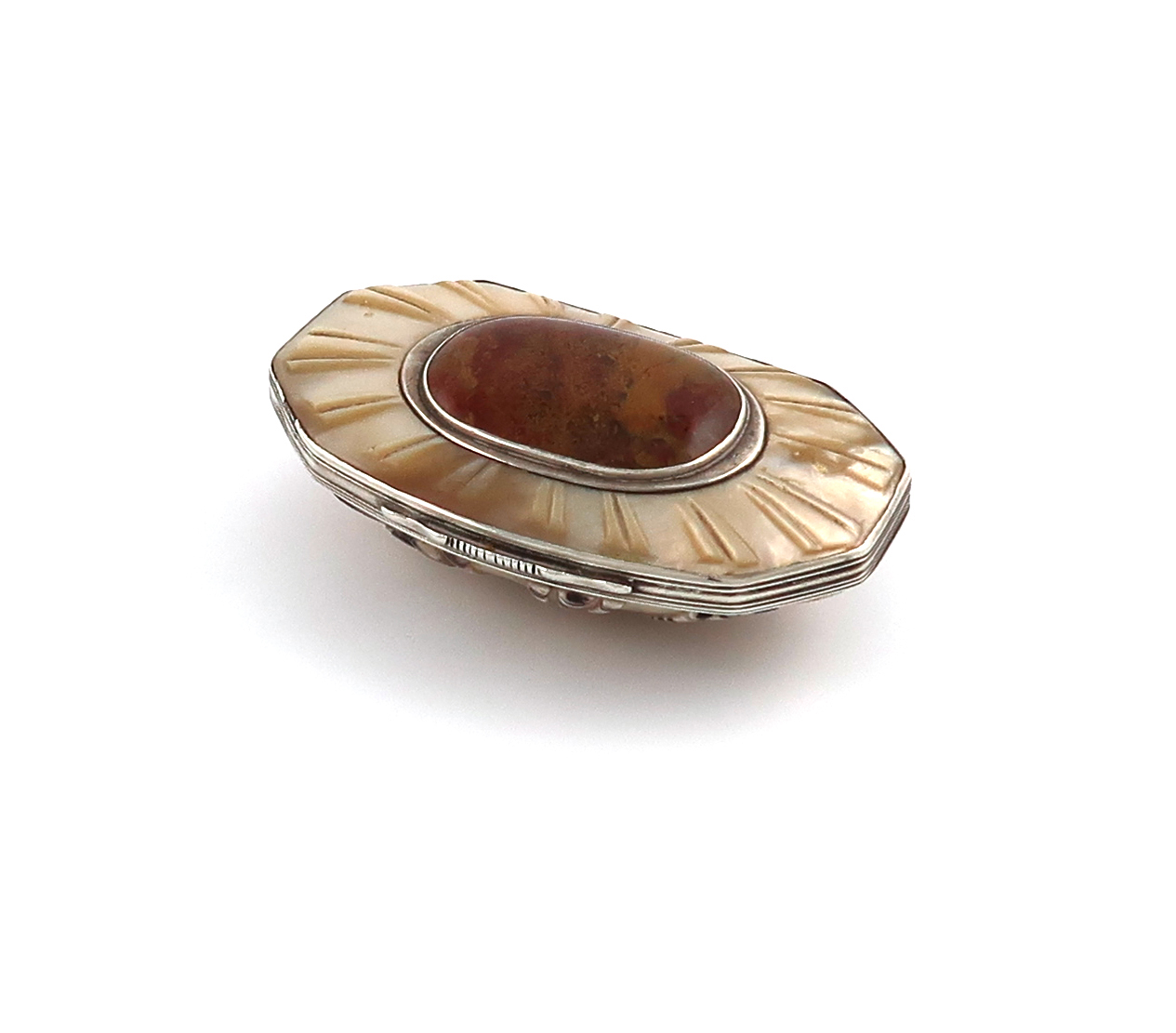 shaped rectangular form, the hinged cover set with an oval agate panel, carved shell body, length 8cm.