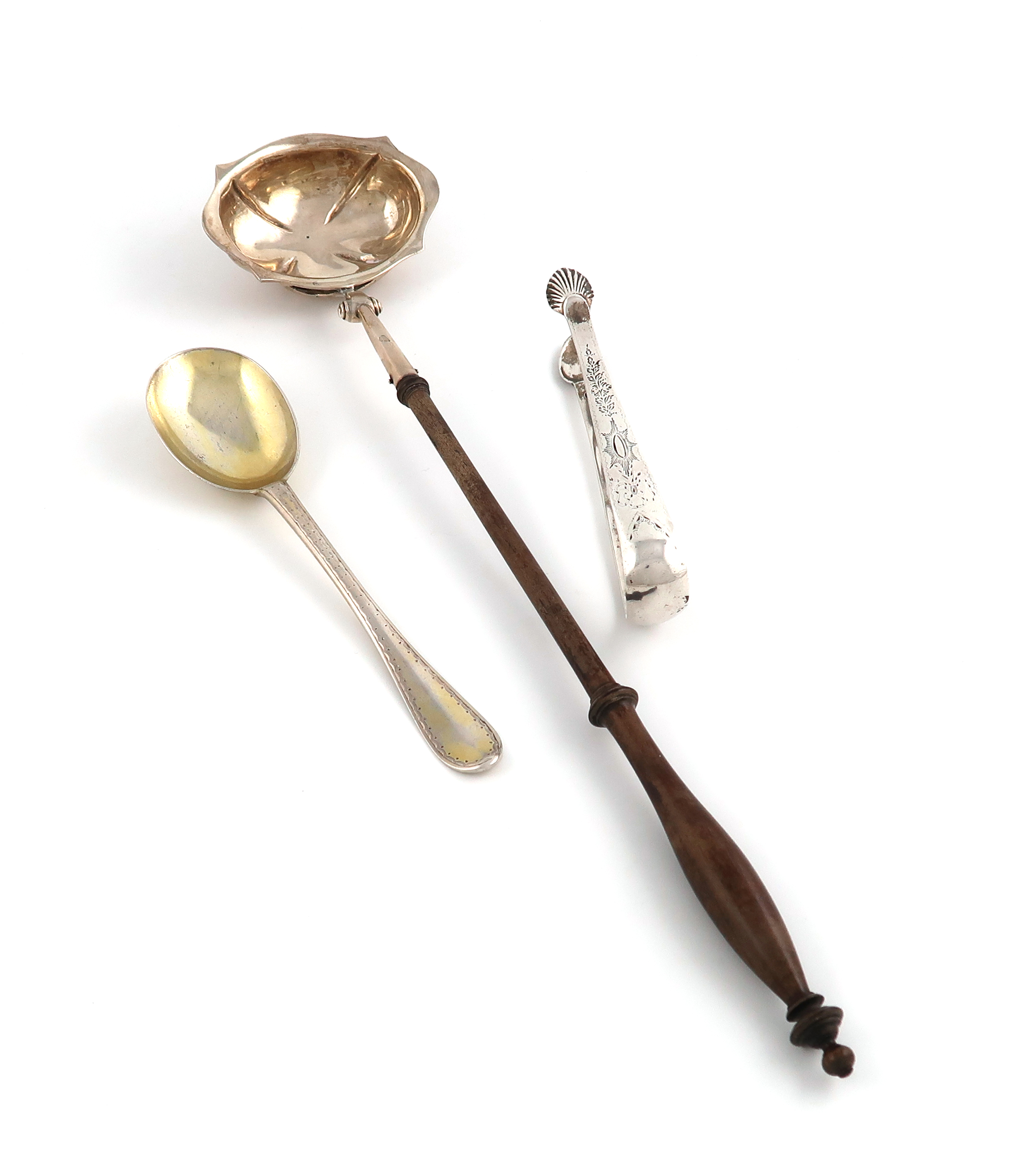 comprising: a punch ladle, by William Marshall, Edinburgh 1838, turned wooden handle, plus a pair of sugar tongs and a re-fashioned spoon, approx. weight 4oz. (3)