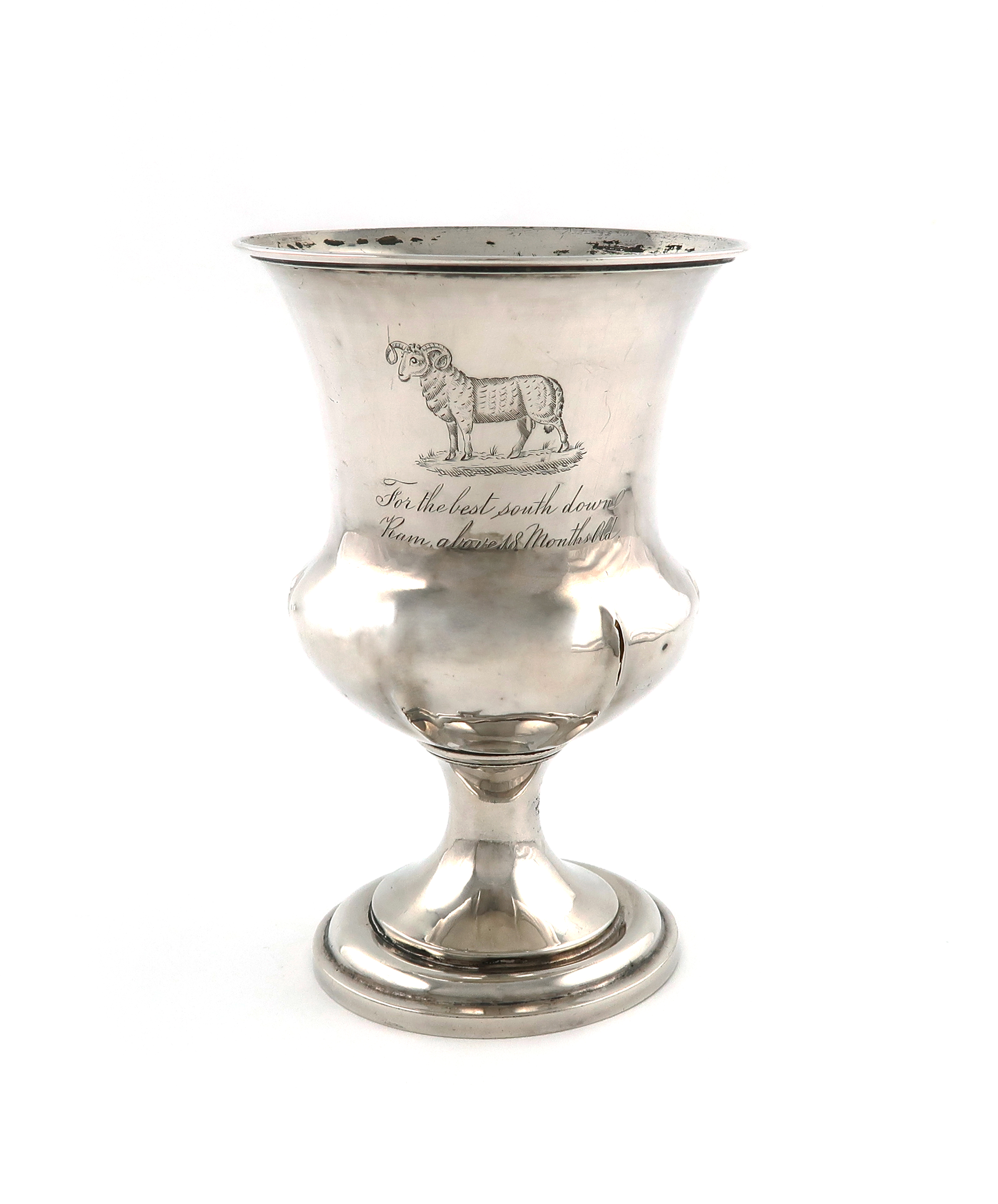 campana form, engraved with a ram and inscribed 'For the best South Down Ram, above 18 months old', on a raised circular foot, height 16.8cm, approx. weight 7.2oz.